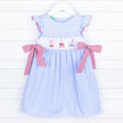 This Circus Show Blue Gingham Beverly Dress is a must for your little one. Features flutter sleeves, side bows, and hand-smocked circus show. The smocking features a performance of a cute elephant and seal.