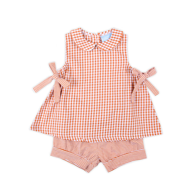 Show your team spirit in style with our Collegiate Grace Short Set. This Peter Pan collar gingham top features adorable side-tie bows in a solid coordinating color. Paired with bubble shorts, it's an easy outfit for football season, school days, and playtime! Available in a variety of gingham colors, you can personalize your outfit further by adding a monogram, team name or saying of your choice, making it easy to cheer for your favorite team!