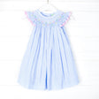 The Geo Floral Smocked Dress Blue Gingham is made for the next sunny occasion. Dress features light blue gingham fabric, angel sleeves, pink gingham trim, and geometric smocking.
