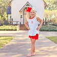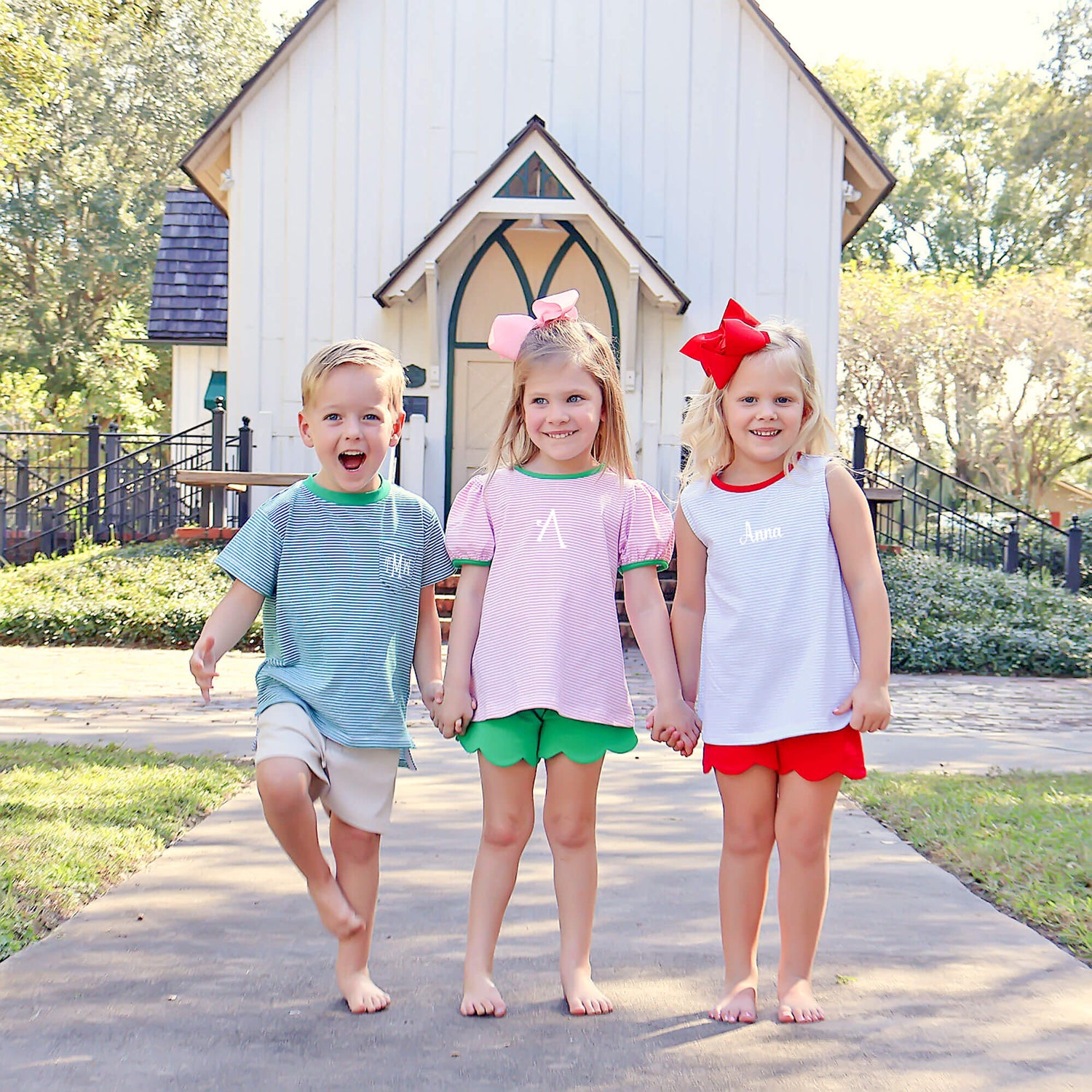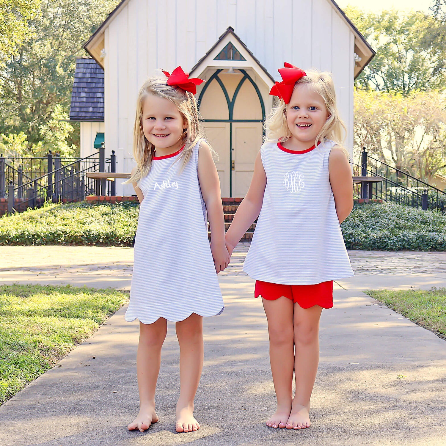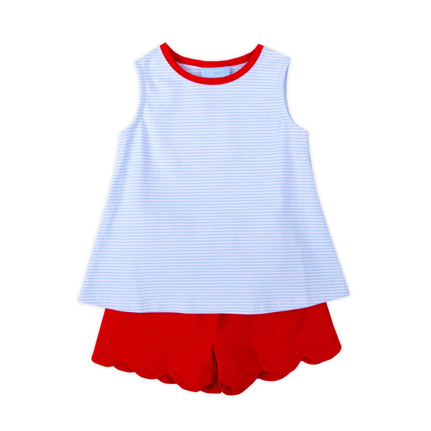 Your little girl will love twirling through spring and summer in the Light Blue Stripe Liv Short Set! This Liv-style top, crafted from a striped knit, features a sleeveless design for a fresh, airy feel. The set is paired with red scalloped shorts, adding a playful pop of color. Add a monogram to make it uniquely hers. It’s the perfect outfit for creating sweet memories and enjoying sunny days!