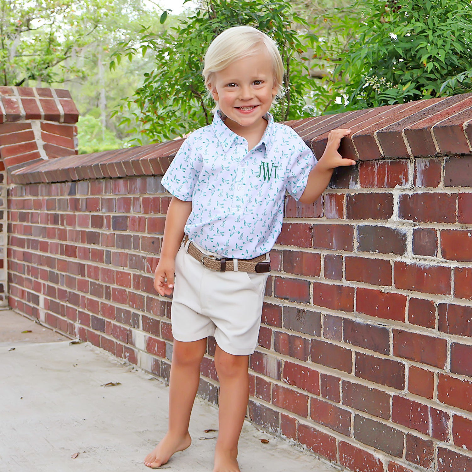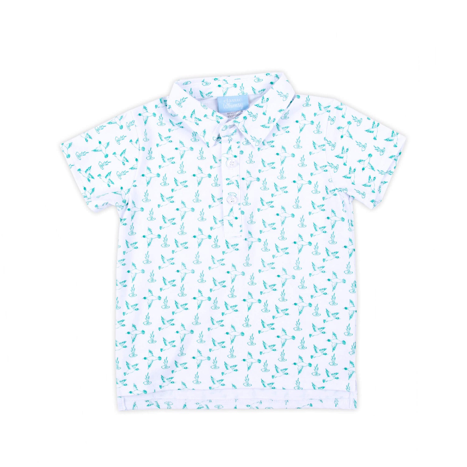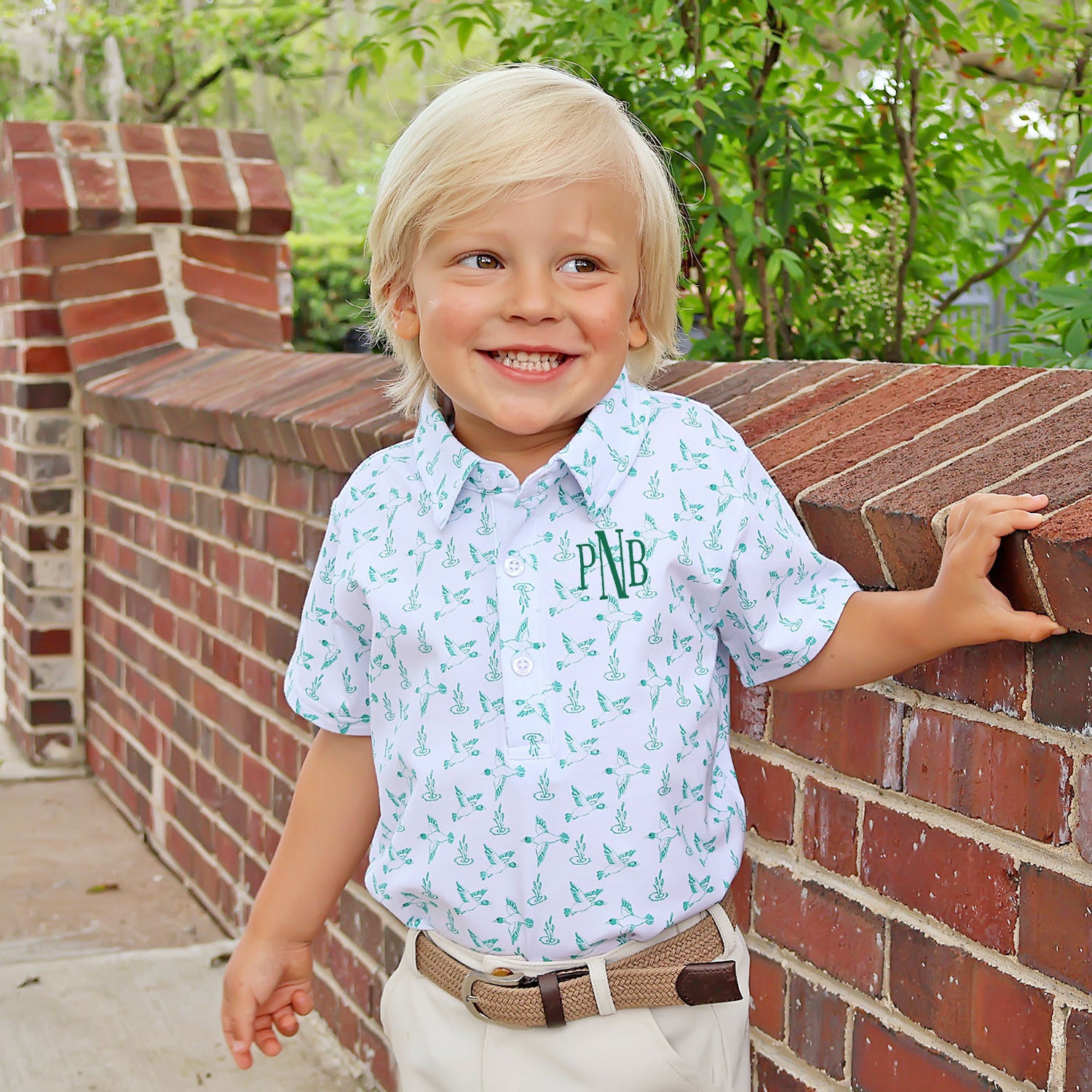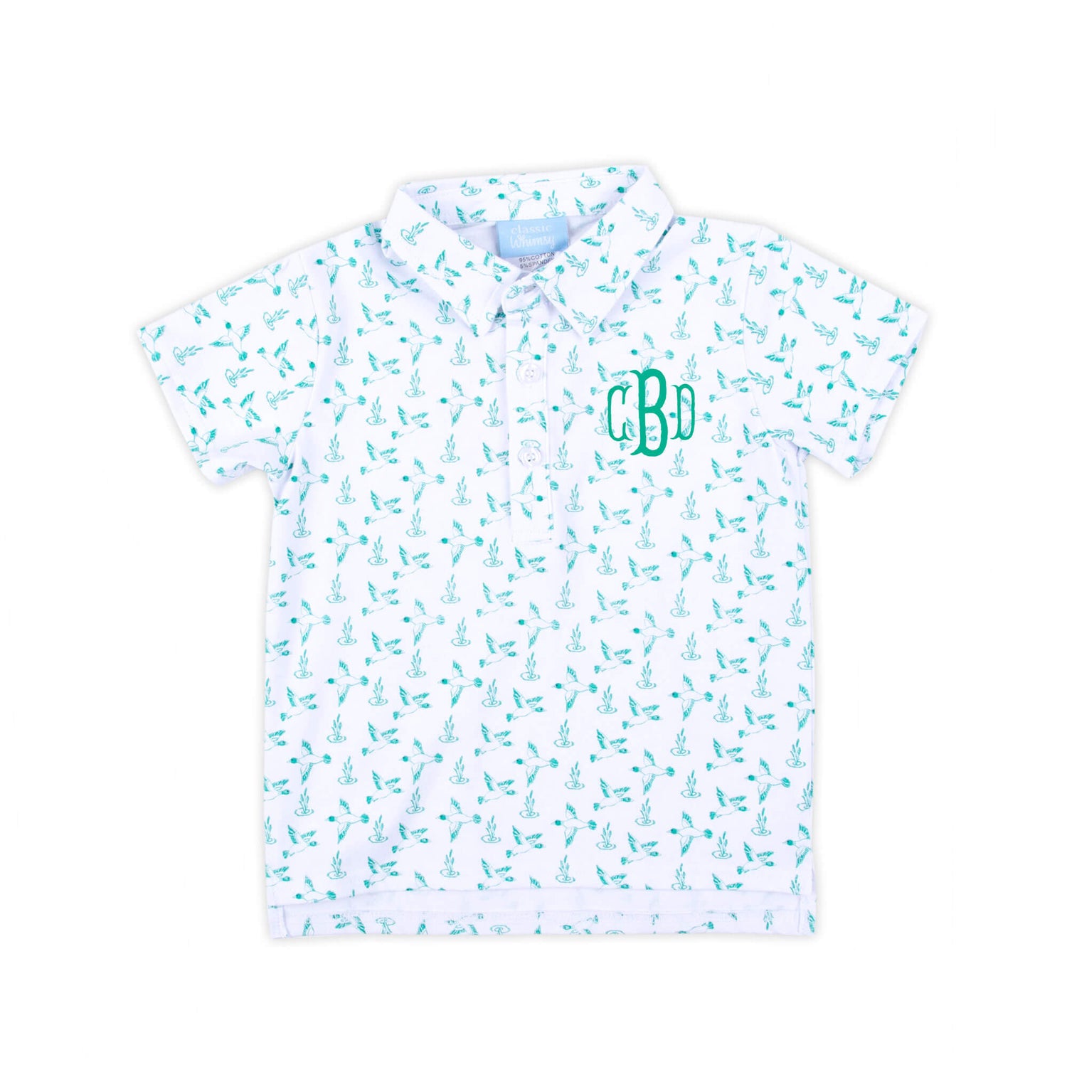 Quack! Quack! Your little duckling will love this Mallard Pond Polo. This short sleeve polo, featuring a beautifully mallard duck print, is perfect for playtime or any outing. Personalize the look with a monogram to make it uniquely his!