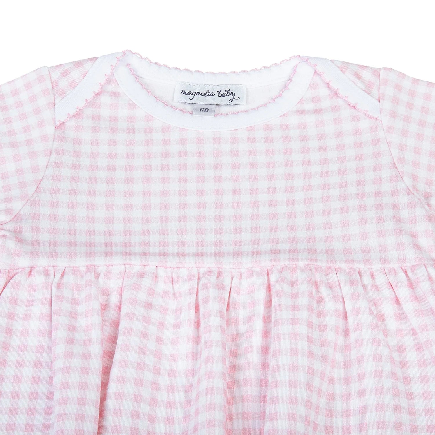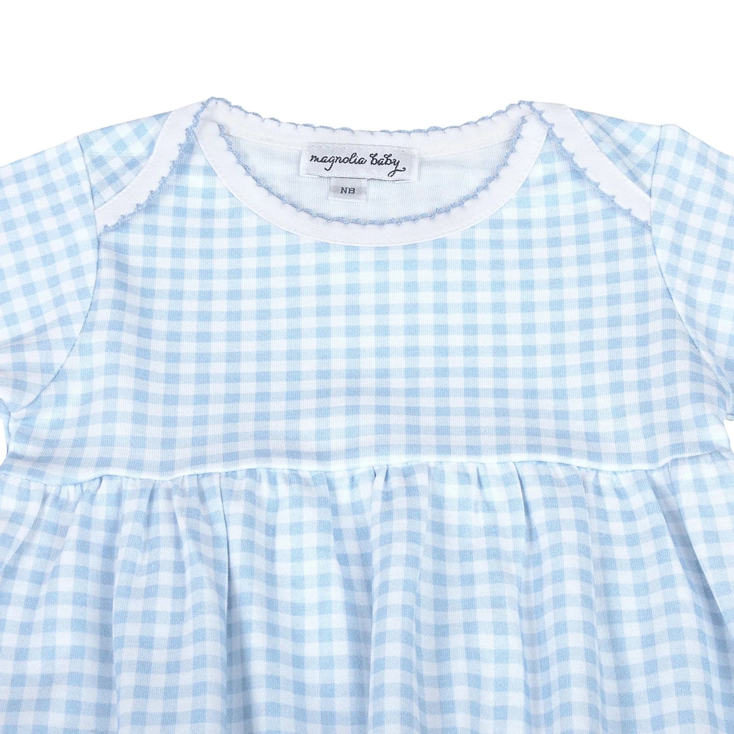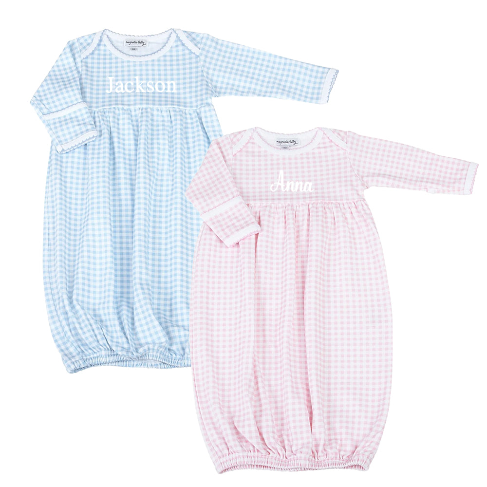 Magnolia Baby's Mini Checks Knit Gathered Gown is a classic and perfect for any occasion. Crafted from 100% Pima cotton, this mini check pattern in blue and pink adds a touch of classic elegance, while the snap closure ensures easy dressing and diaper changes. Mix and match this gown with other pieces in Magnolia Baby's Mini Checks collection for a perfectly coordinated outfit. Machine washable for easy care.