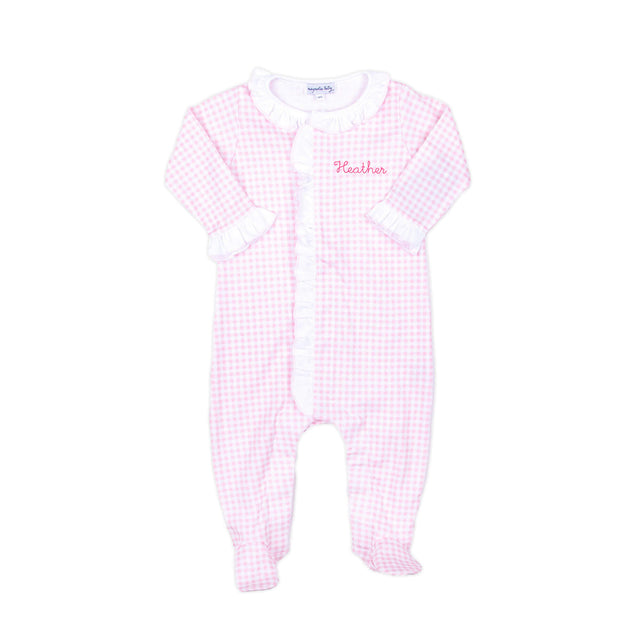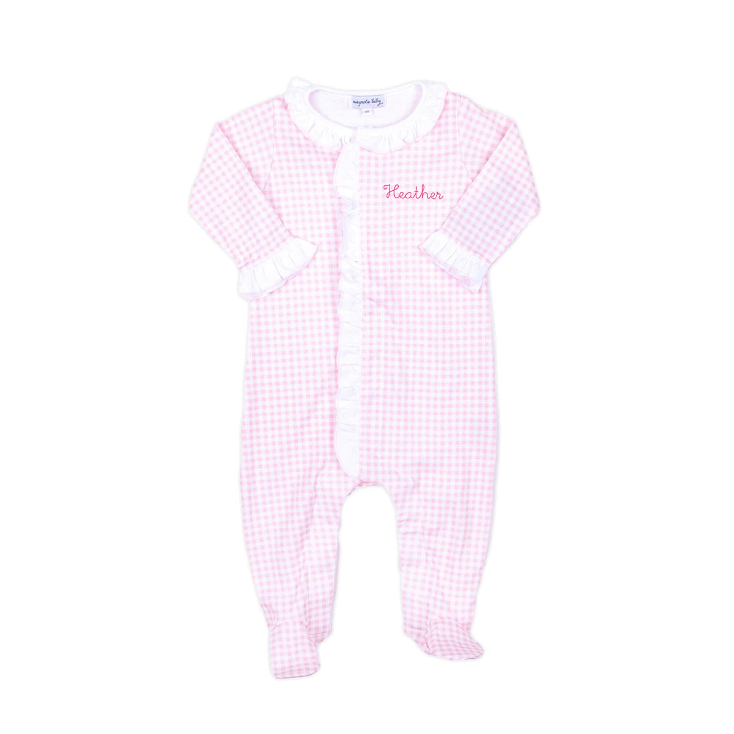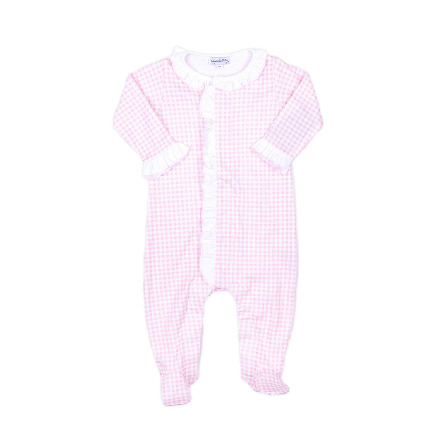 The sweetest baby sleeper with feet made from the softest pima cotton. Pink includes a soft ruffle trim. Coordinates with other items in the Mini Checks Collection from Magnolia Baby.