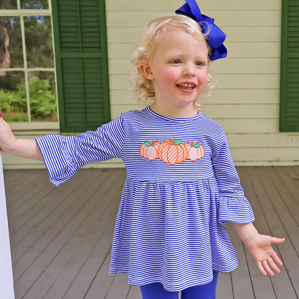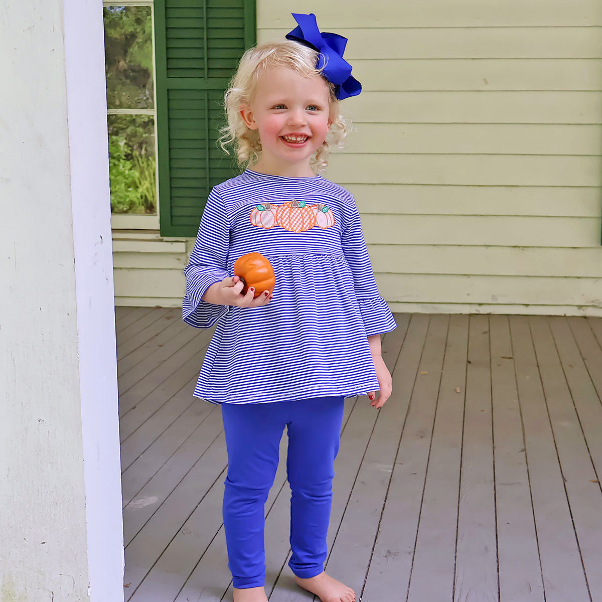 Add a touch of fall fun to your little one's wardrobe with our Pumpkin Cluster Royal Blue Stripe Sophia Legging Set! This adorable blue stripe Sophia-style top features 3/4 sleeves and charming pumpkin cluster appliqués. Paired with royal blue leggings, this set is perfect for all your autumn adventures.