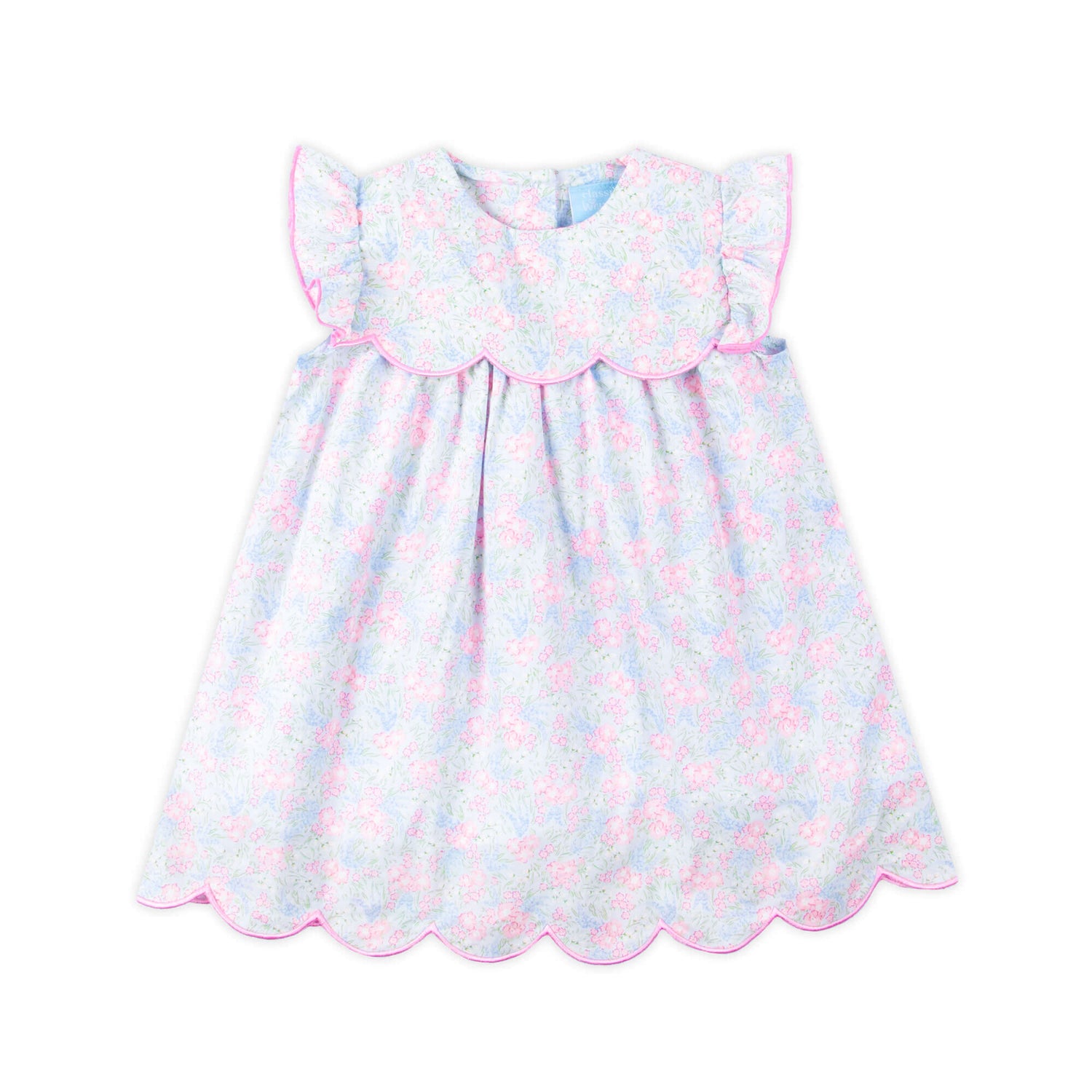 This Vintage Garden Blue Floral Amelia Dress is a stylish and comfortable outfit, perfect for any sunny day. The Garden Blue Floral Amelia-style dress features fluttered sleeves, and a scalloped hem with light pink merrow edge. Personalize it by adding a monogram!