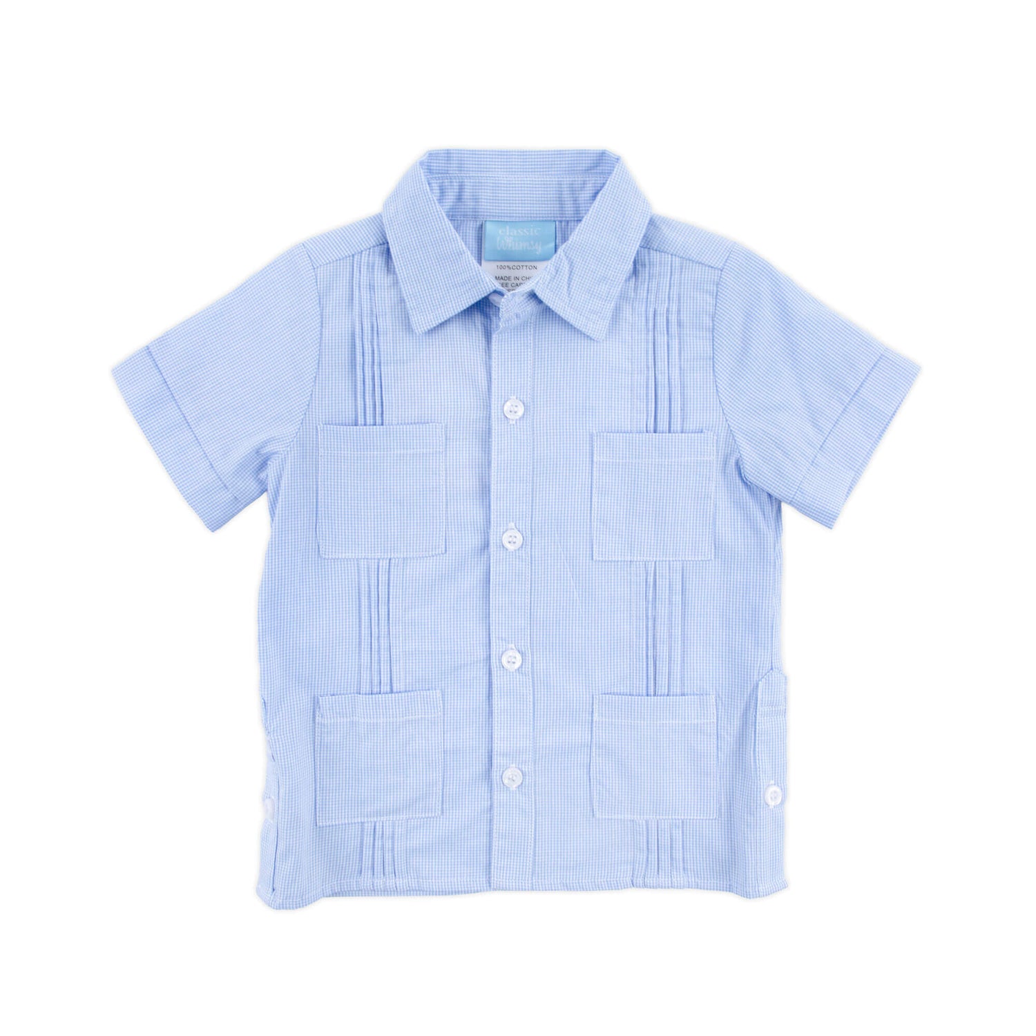 Don't forget to pack this Blue Gingham Guayabera Shirt for your next resort vacation or Cinco de Mayo celebration! It features four front pockets and blue embroidery details. Personalize this Guayabera for your toddler boy or big kid by adding a monogram.