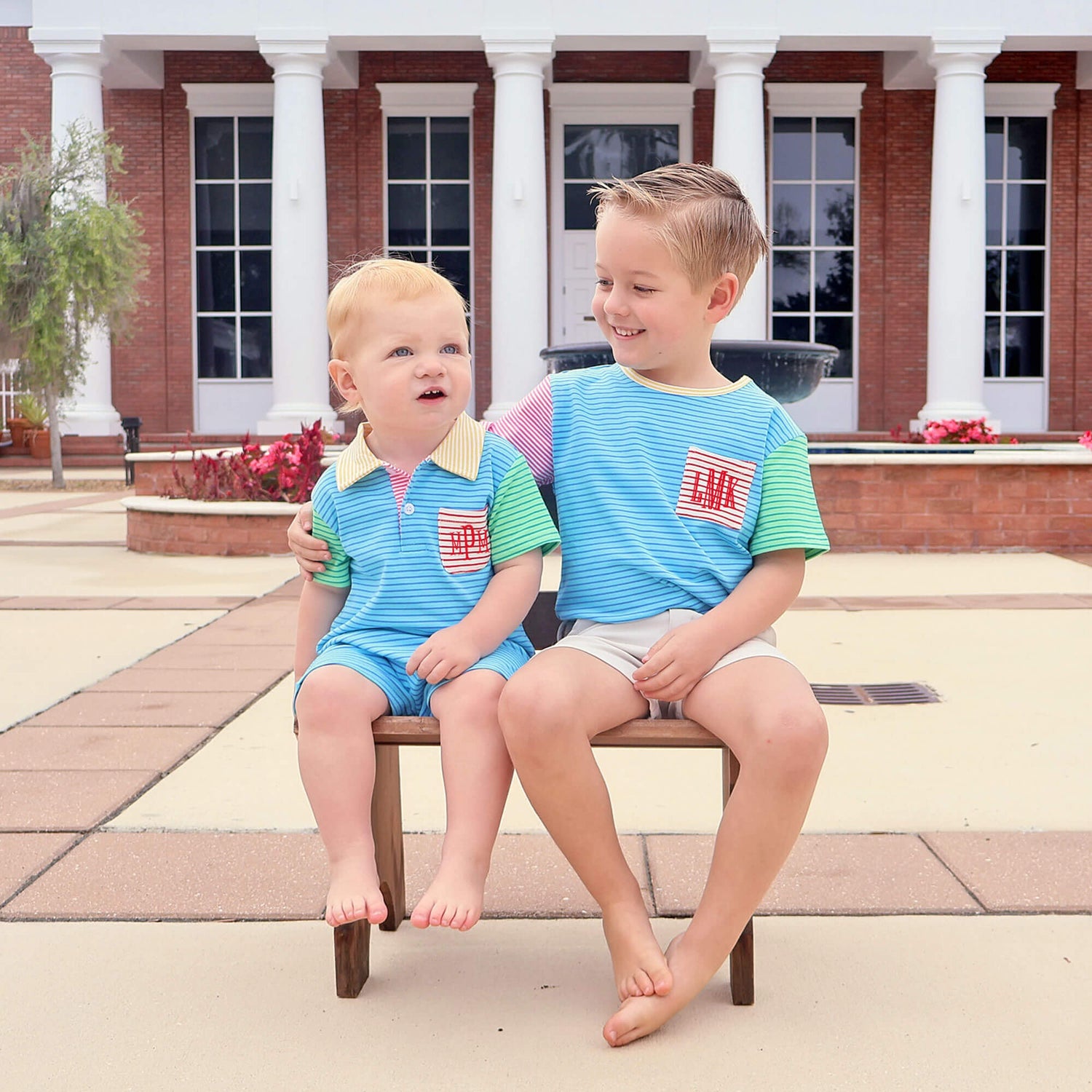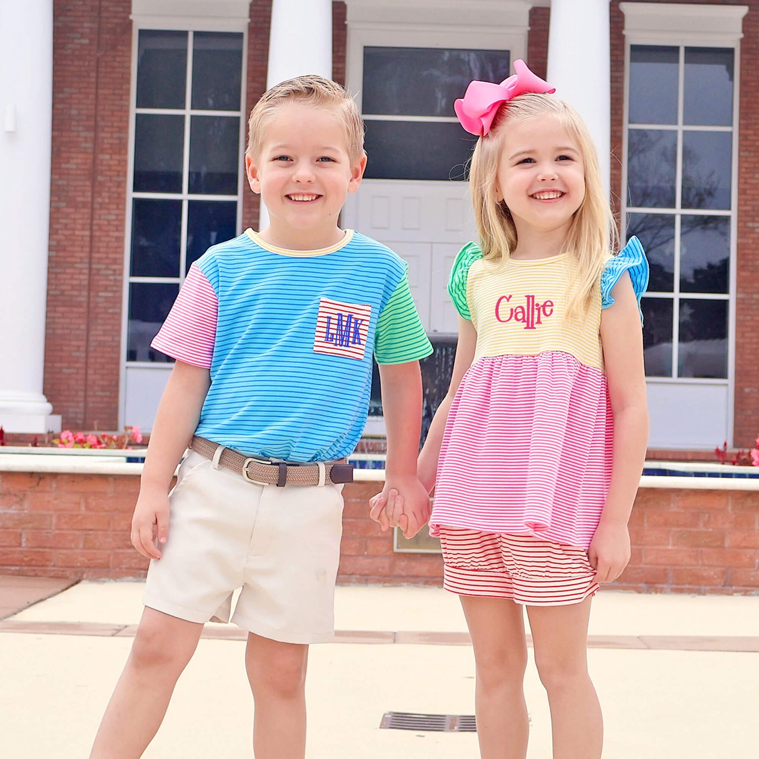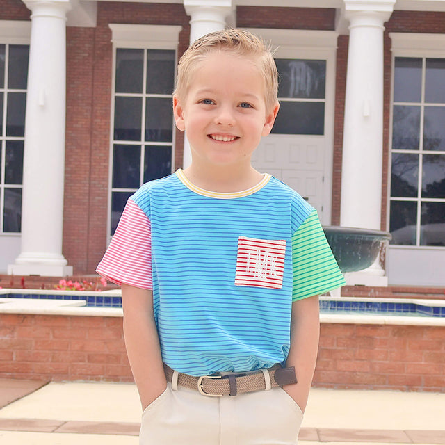 This cheerful Colorblock Stripe Short Sleeve Pocket Shirt is perfect for playtime this spring and summer. The soft knit shirt features colorblock stripes, short sleeves, and a side pocket.