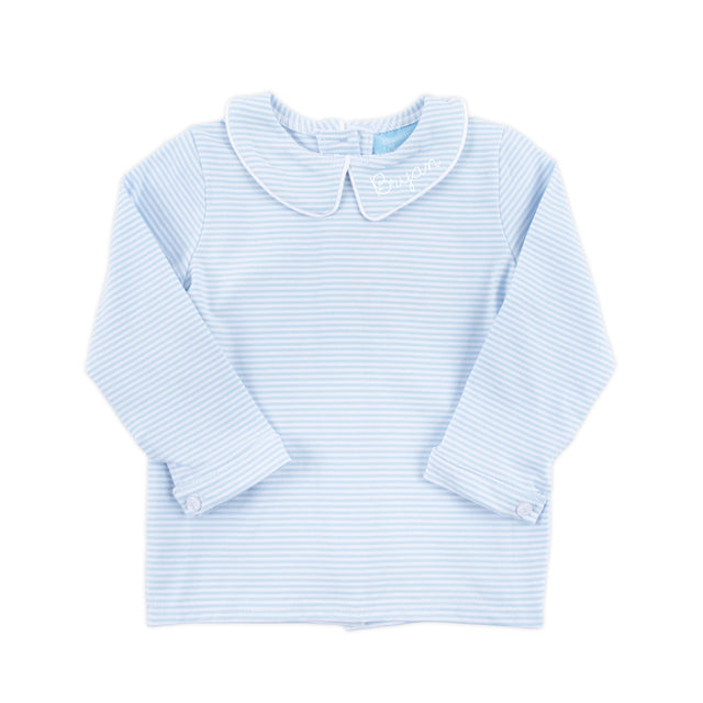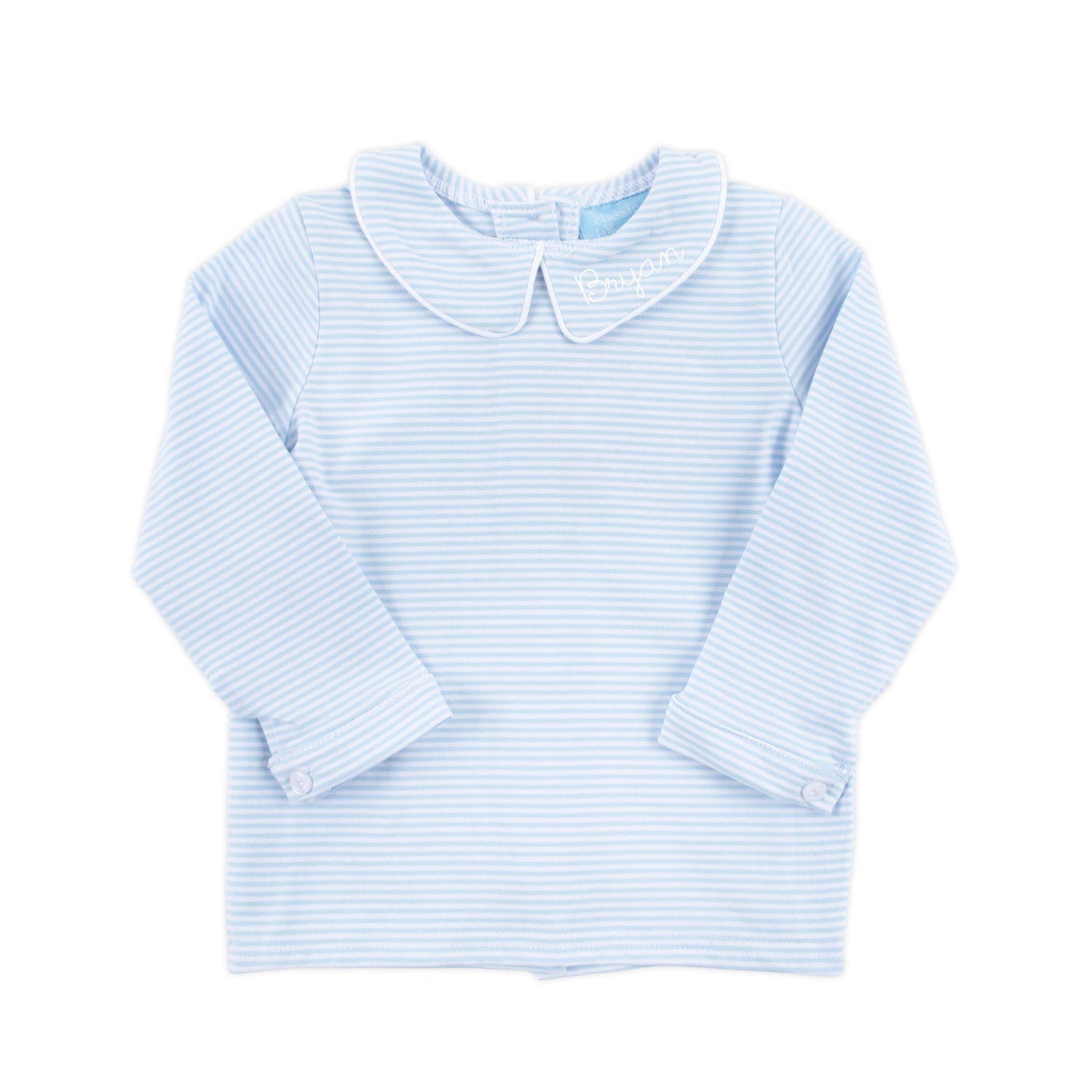 Celebrate the holiday season in our Light Blue Stripe Undershirt. This long sleeve undershirt with a sweet collar is perfect for layering to keep your little one warm during the chilly season. Pair it under one of our classic longalls for a cozy look. Add a monogram on the collar for a personalized touch.