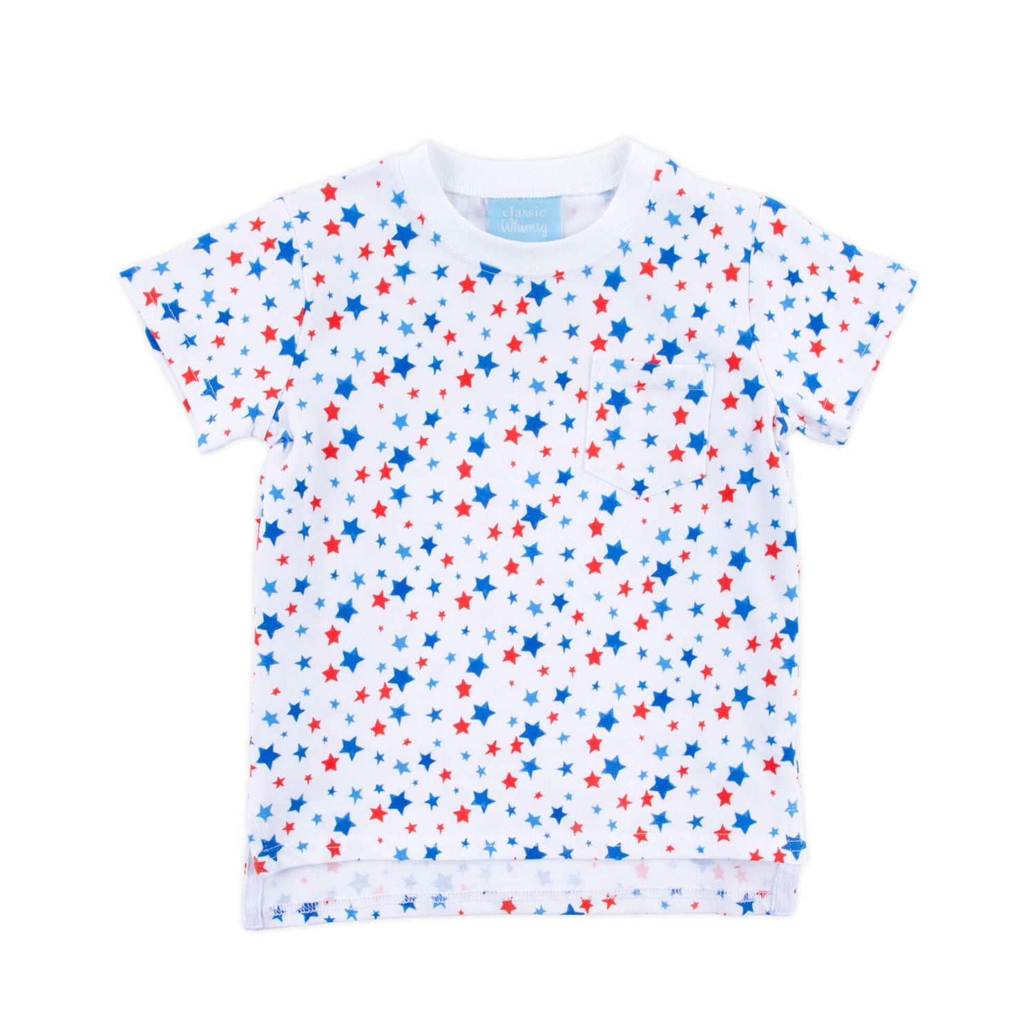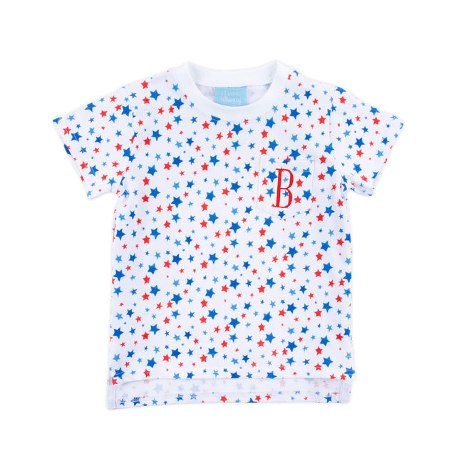 It’s time to watch fireworks in our Shoot for the Stars Short Sleeve Pocket Shirt! This knit short-sleeve shirt features a fun patriotic star print and a side pocket, making it perfect for playtime. Add a monogram to make it extra special!