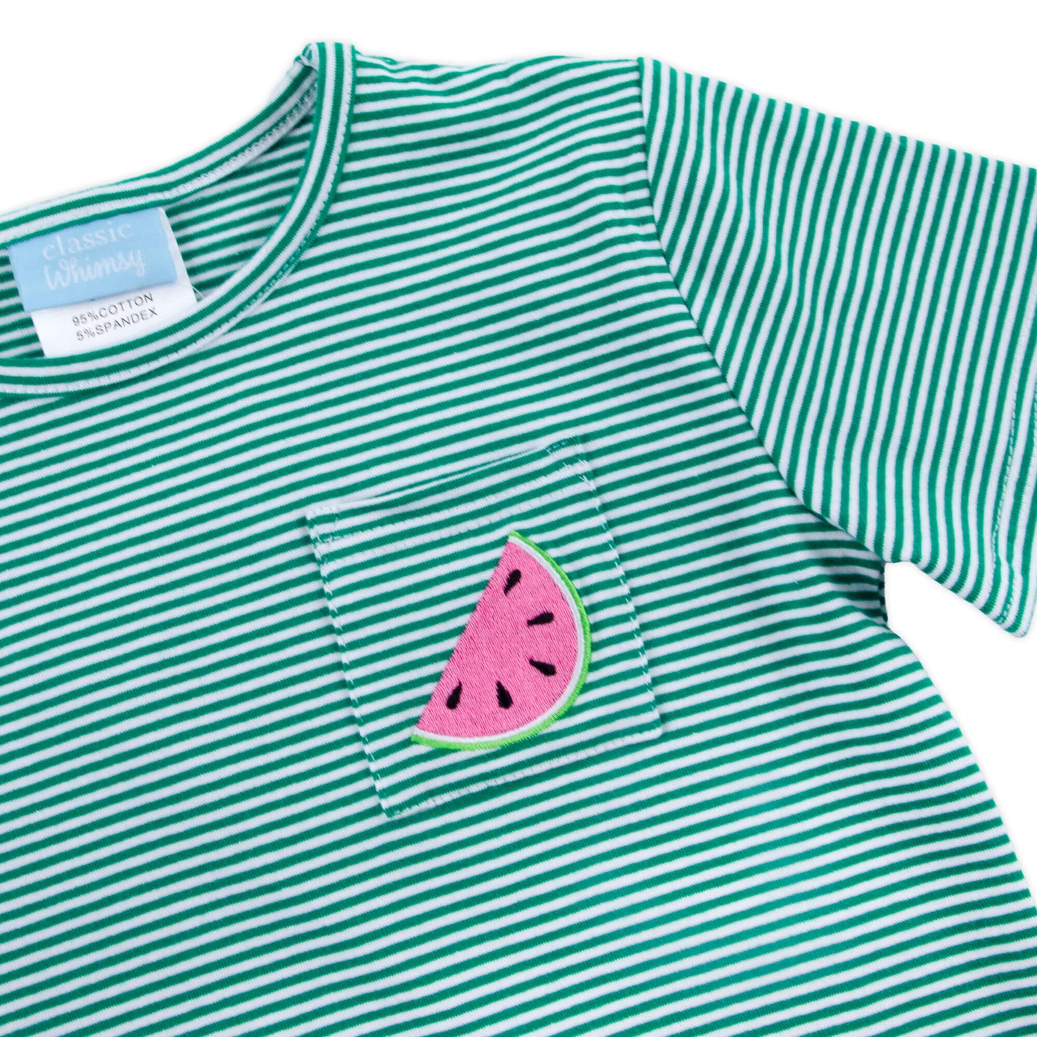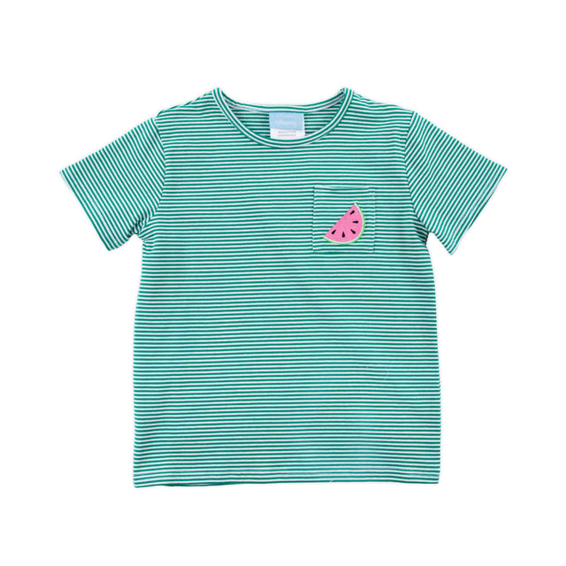 Celebrate summer in style with our Sweet Watermelon Green Stripe Short Sleeve Pocket Shirt. The green stripe knit shirt features a side pocket and a cheerful embroidered watermelon, completing this sunny look.