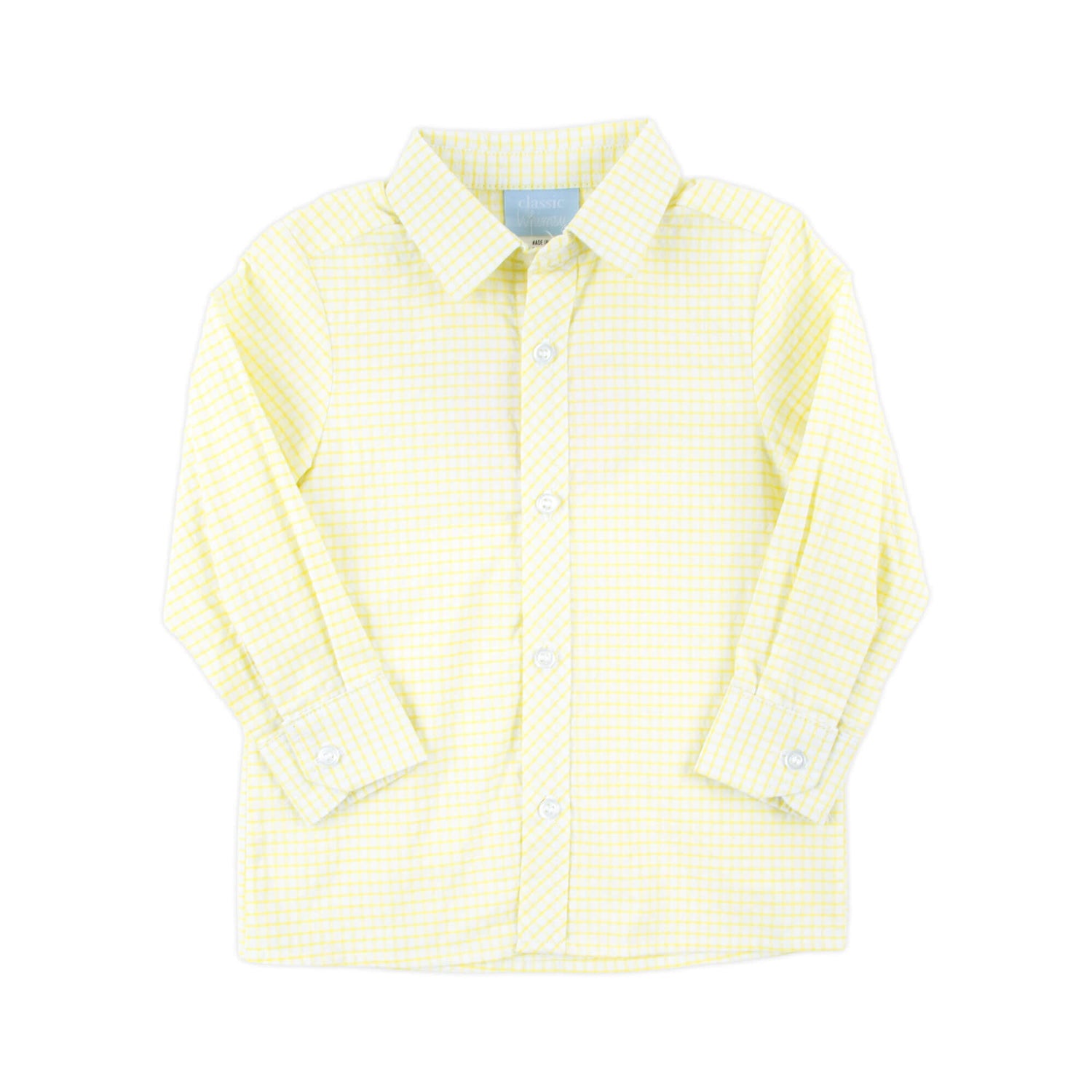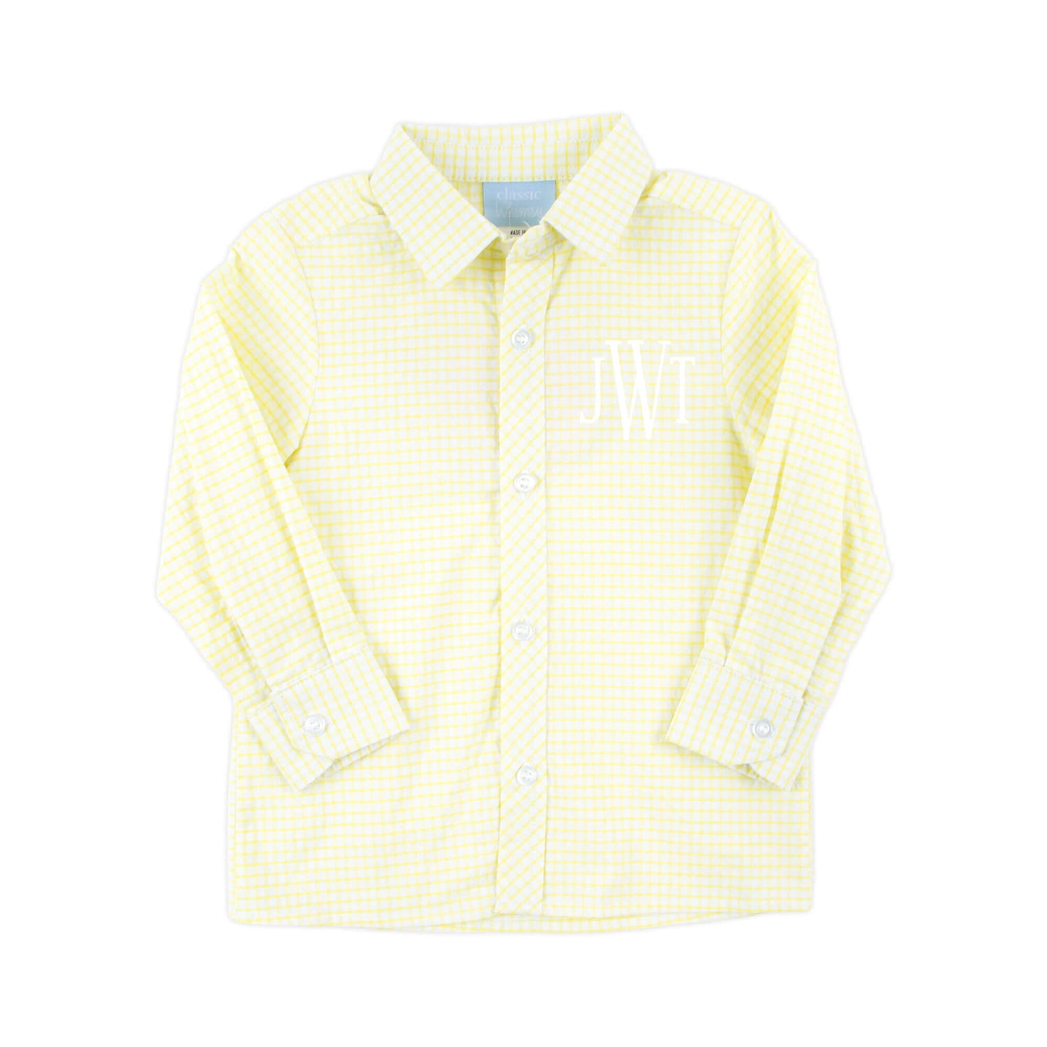 The yellow and white windowpane Boys Button-Down Shirt is a perfect selection for Easter egg hunts. For a personal touch, consider adding a monogram. This shirt is a distinguished part of our Hoppy Bunnies collection for darling matching sibling moments.
