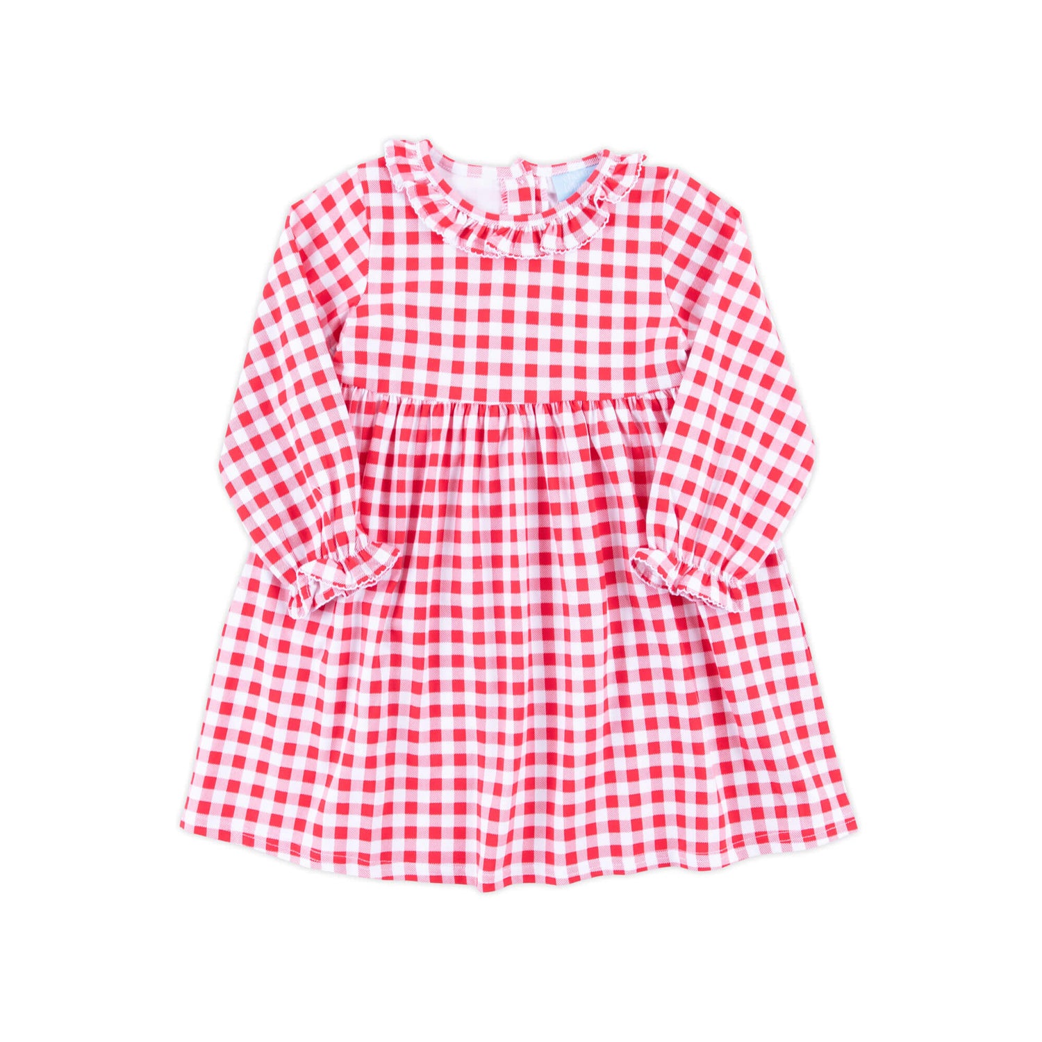 Add a sweet pop of color this fall with our adorable Red Check Eden Dress! This charming red check knit dress features playful long bishop sleeves and a darling ruffle collar, making it the perfect choice for a fun and stylish day out. Plus, you can add a personalized monogram to make it uniquely yours