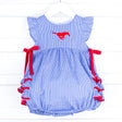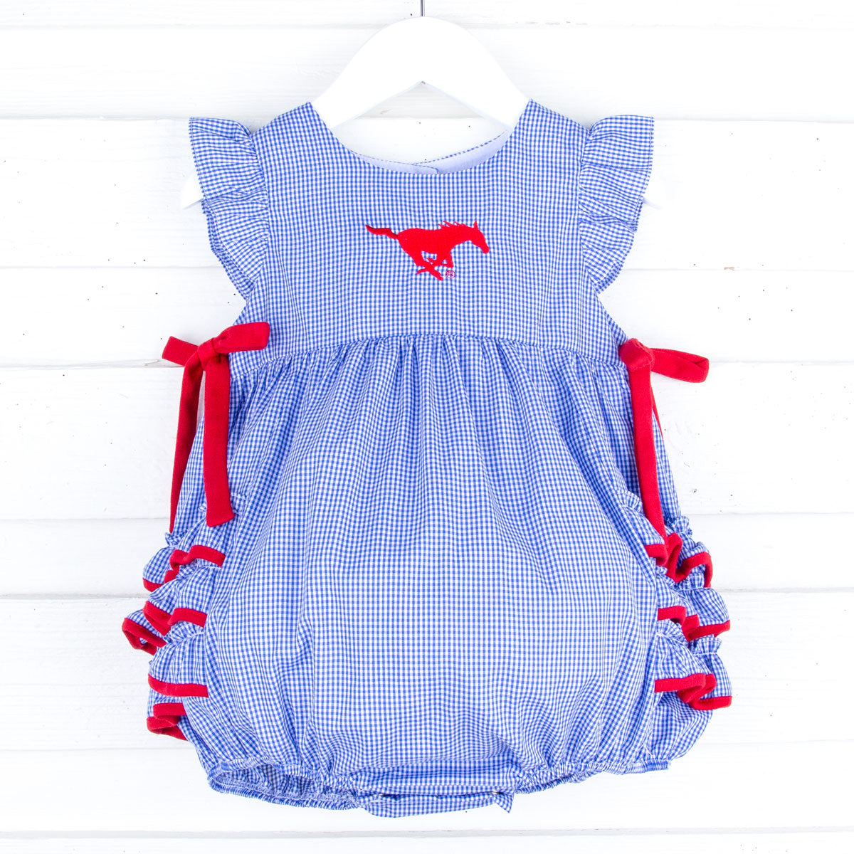 Pony Up! Get your little one ready for football season in style with our SMU Embroidered Royal Blue Ruffle Bubble. This adorable gingham bubble features the SMU embroidered logo, charming ruffled sleeves, and sweet red side-tie bows. With convenient snaps in stride and back buttons for closure, it's as practical as it is cute!