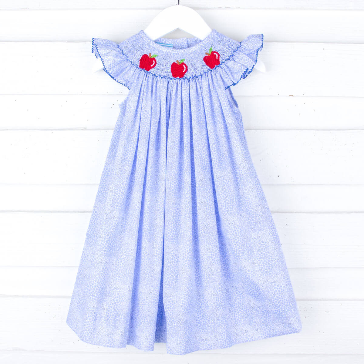 Step into style with our Apple Smocked Blue Floral Angel Sleeve Dress, perfect for back-to-school and transitioning into the fall season. This dress features the sweetest blue floral print complemented by charming red apple smocking. Designed with beautiful angel-style sleeves adorned with blue picot trim, it's an ideal outfit for all your fall activities.