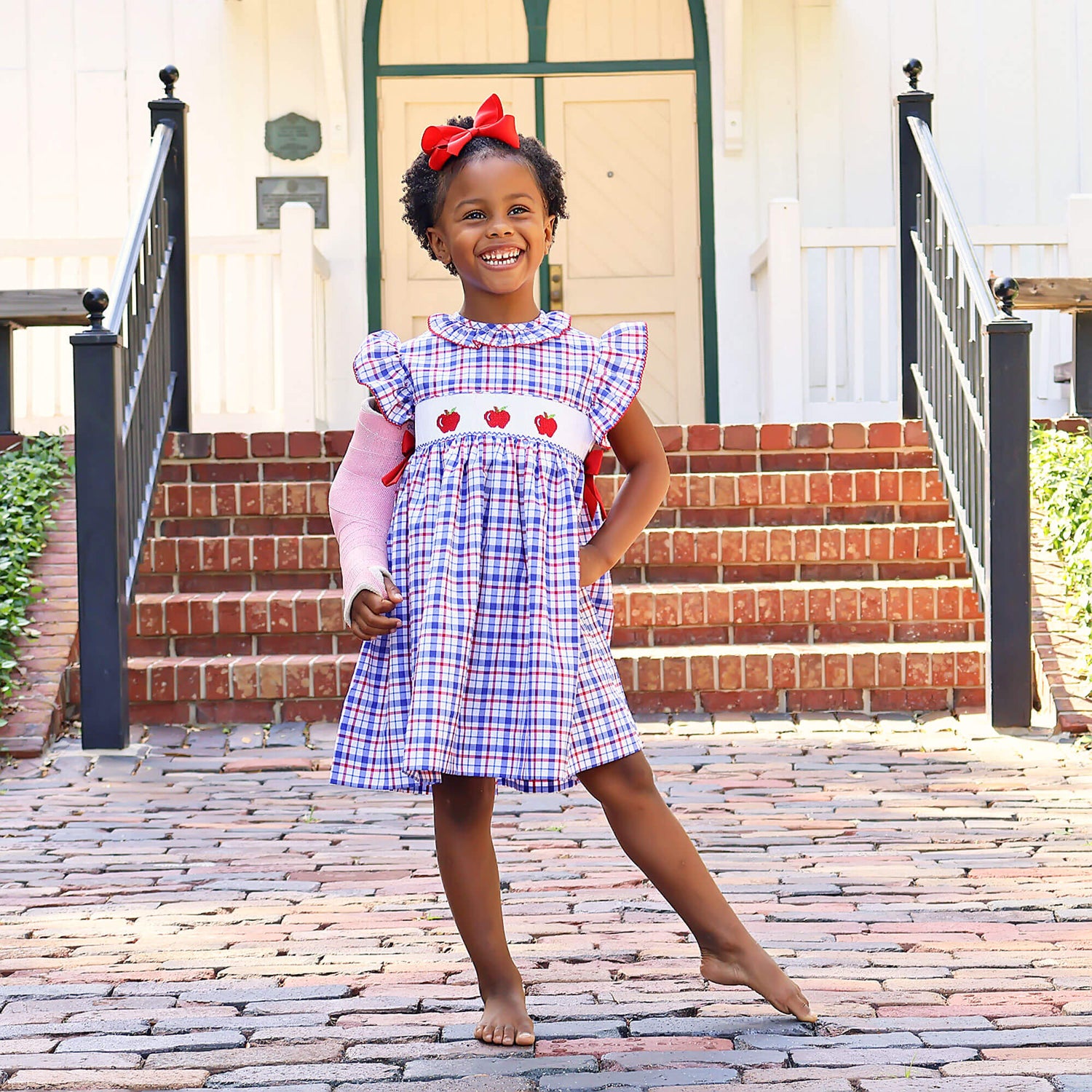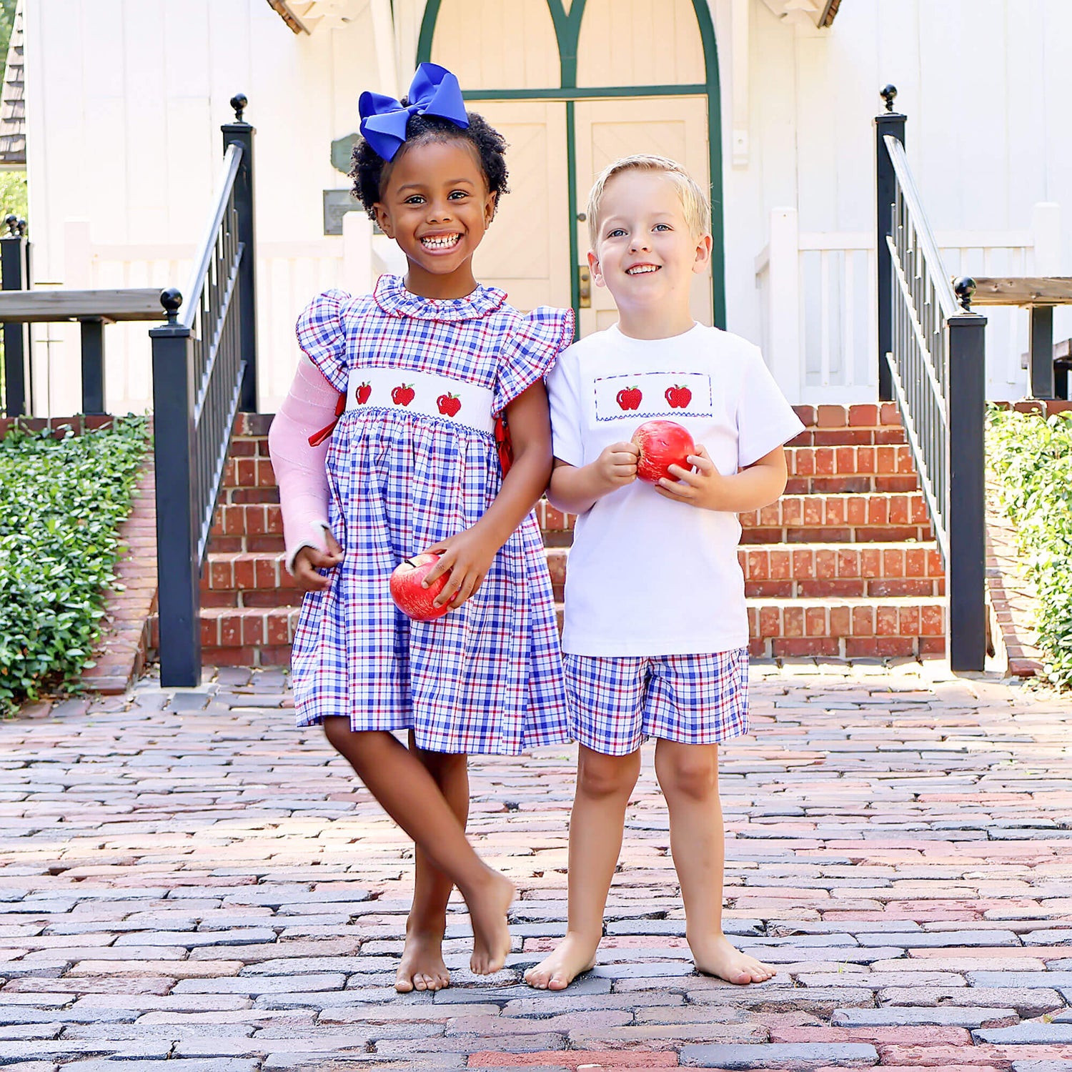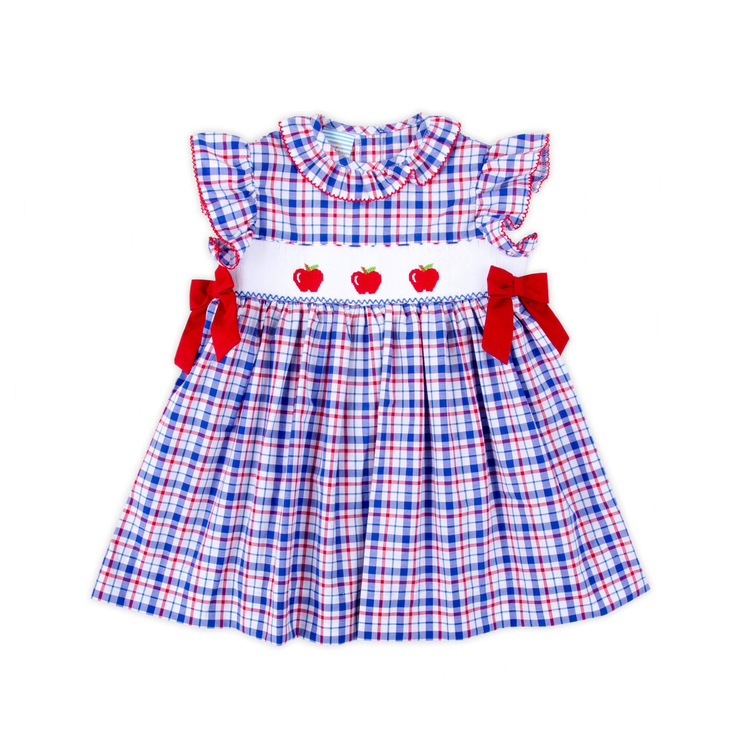 Kick off the school year in style with our charming Apple Smocked Plaid Beverly Dress! This sweet red and navy plaid dress features hand-smocked red apples and darling side tie bows. Perfect for a day full of learning and play.