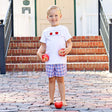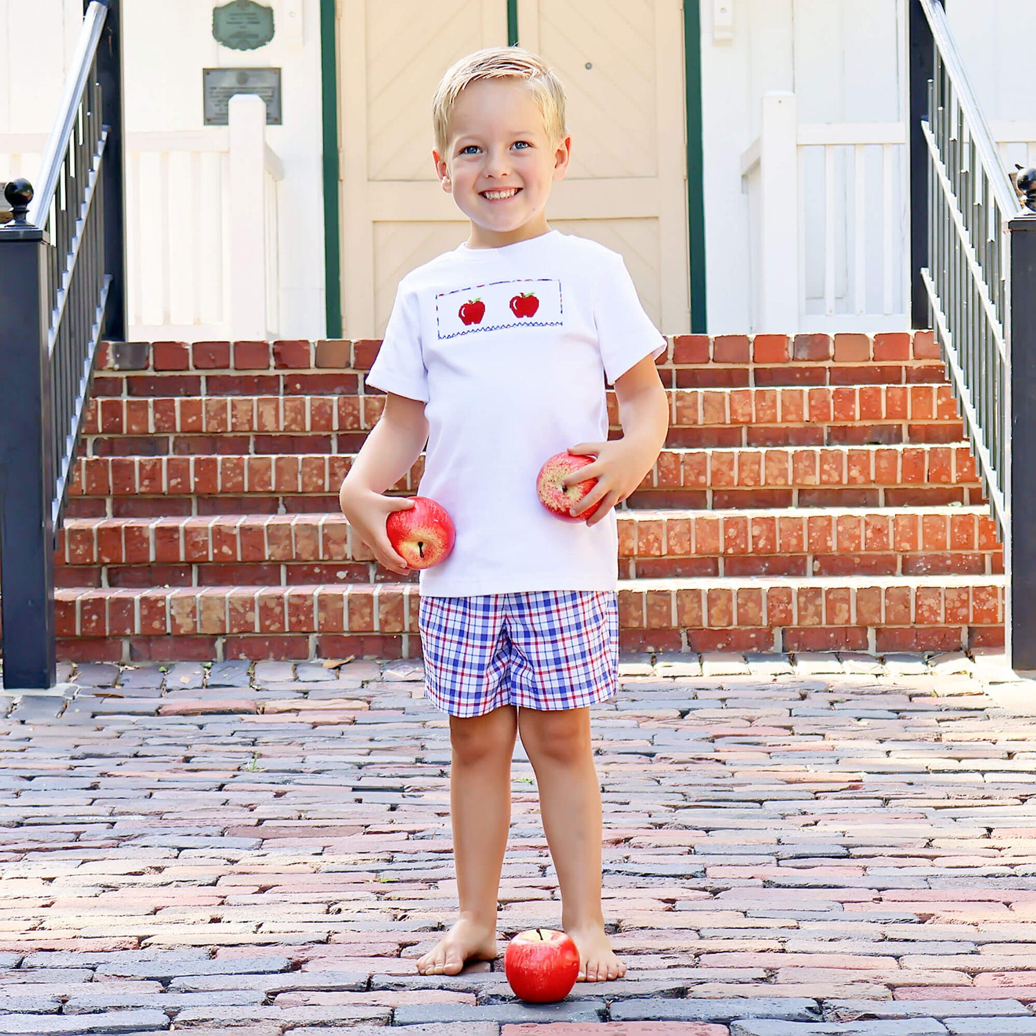 Kick off the school year in style with our charming Apple Smocked Plaid Short Set! This adorable white knit shirt features sweet hand-smocked red apples. Paired with red and navy plaid shorts, it's perfect for a day full of learning and play!