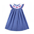 This Flag Smocked Royal Check Angel Sleeve Dress is the perfect outfit for watching fireworks and celebrating a 4th of July cookout! Made from royal blue check fabric, this dress features charming flag smocking and angel-style sleeves adorned with red ric-rac trim for an extra festive touch.