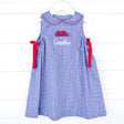 Go team! Show your spirit for University of Mississippi with our Ole Miss Embroidered Navy Dress. This sleeveless gingham dress features a charming peter-pan collar, and sweet red side-tie bows, all complemented by the embroidered Ole Miss logo. Whether you're cheering from the sidelines or watching the game at home, this is the perfect outfit to support your team in style! Add a name monogram!