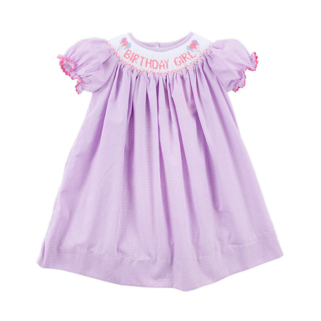 Celebrate your little one's birthday party in style with our Birthday Girl Smocked Dress. This sweet lavender gingham dress features hand-smocked "Birthday Girl" detailing. Adorable bishop sleeves with candy pink ric-rac trim add an extra touch of charm.