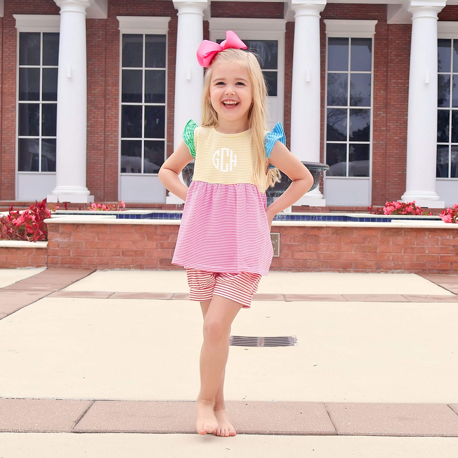 This cheerful Colorblock Stripe Alexa Short Set is perfect for playtime this spring and summer. The soft knit top features colorblock stripes and flutter sleeves, paired with coordinating red stripe shorts. Add a monogram for a personalized and playful touch!