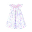 Embrace sunny days with the Monet's Garden Smocked Angel Sleeve Dress, the perfect choice for any occasion. This dress features a delightful pink and purple floral print, coupled with charming geometric smocking and angel sleeves adorned with purple trim picot. It's the ideal outfit to brighten up your little one's style for any sunny occasion.