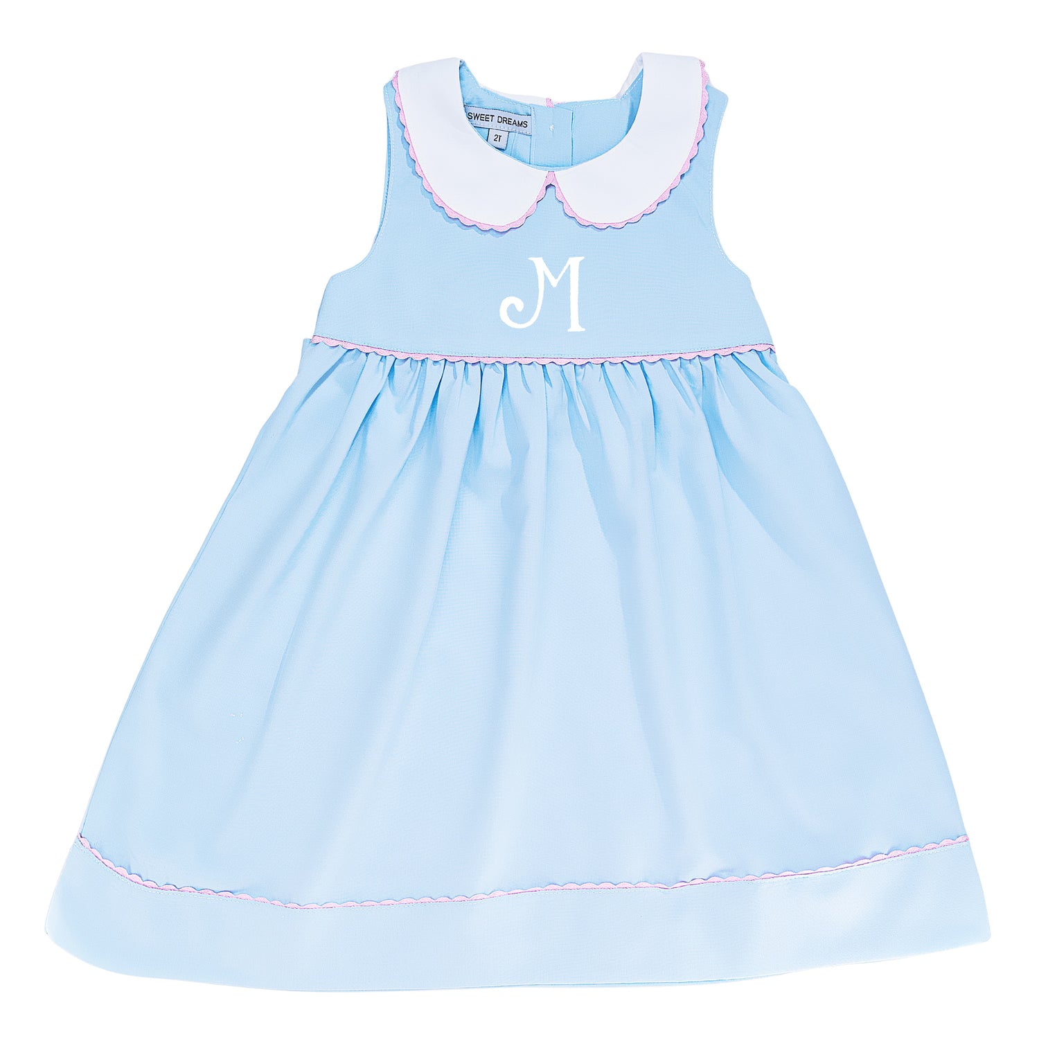 This Blue with White Collared Dress is the sweetest spring outfit! The sleeveless design features a delicate white collar with pink ric-rac trim, making it perfect for spring and summer. Add a monogram to make it extra special!