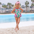 Get ready for sunshine and beach days in our Tropical Vibes Swimsuit! This one-piece features pink side bows, a cross-back design, pink ric-rac trim, and our favorite tropical palm leaf floral print. Add a monogram to personalize this fun swim look!