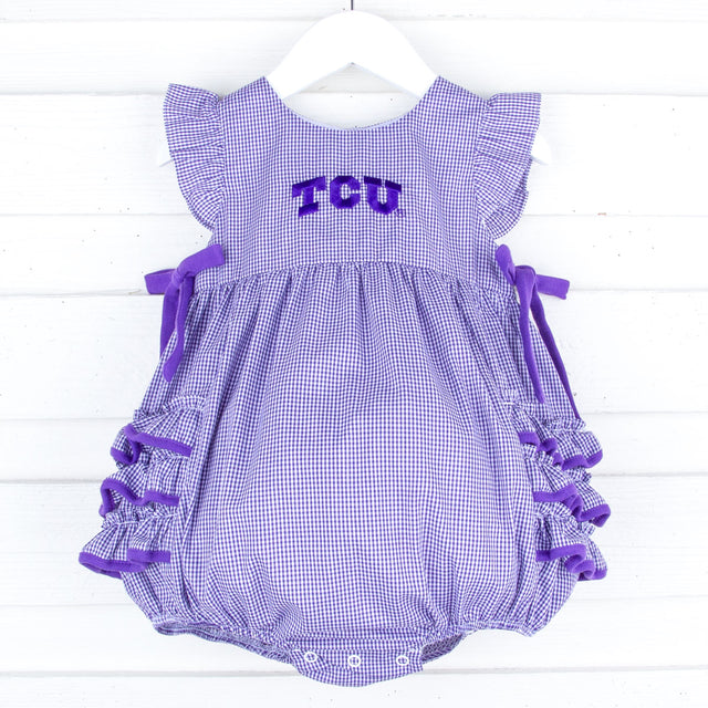Go Frogs! Get your little one ready for football season in style with our TCU Embroidered Purple Ruffle Bubble. This adorable gingham bubble features the TCU embroidered logo, sweet purple side-tie bows, and fluttered sleeves. With convenient snaps in stride and back buttons for closure, it's as practical as it is cute!