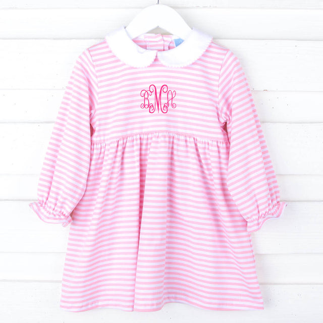 The Pink Stripe Riley Dress is a delightful choice for playtime during cooler weather in soft knit pink and white stripes! Designed with comfort in mind, this long sleeve knit dress is not only perfect for school and playtime but also transitions seamlessly for various occasions. White Peter Pan collar with pink picot trim. Whether it's a casual outing or a day at school, this dress ensures both style and comfort. Elevate its charm by adding a monogram, making it uniquely adorable.