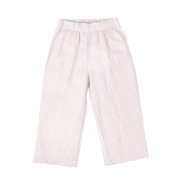 These Tan Gingham Pants are a classic addition to your child's wardrobe for all seasons. Featuring a convenient elastic pull-on waist, they are versatile and can be paired with your favorite applique T-shirt or polo shirt for a timeless look. Available in a variety of gingham colors to complement your style, they are both stylish and comfortable, perfect for school, church, play, or a collegiate look.