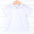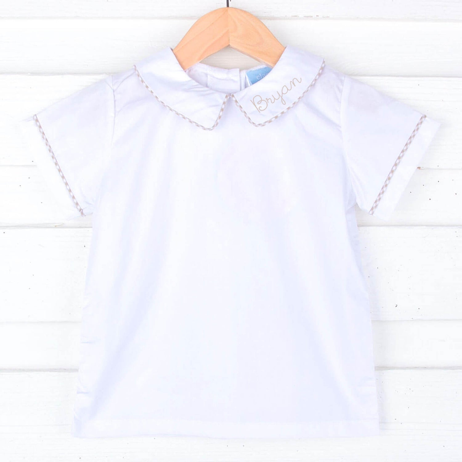 Add this White Short Sleeve Undershirt With Color Trim to your little one's spring and summer wardrobe. This short sleeve white shirt features a collar with piping available in a variety of colors including tan gingham, red, green, light blue and royal blue.