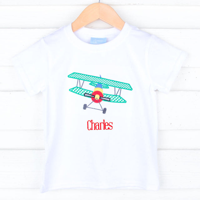 Your little pilot will adore our Airplane White Short Sleeve Shirt, featuring a cool airplane appliqué. This white shirt will quickly become a favorite piece for playtime. Don't forget to personalize it by adding a name monogram below the appliqué!