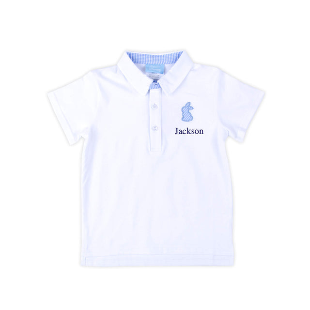 Hop into Easter joy with our Blue Bunny White Short Sleeve Polo! This festive white knit polo features an adorable bunny applique and charming blue gingham accents on the inner tab, bringing a dash of holiday charm to your little one’s Easter wardrobe. Perfect for egg hunts, family gatherings, and Sunday celebrations. Add a monogram to make it uniquely yours!