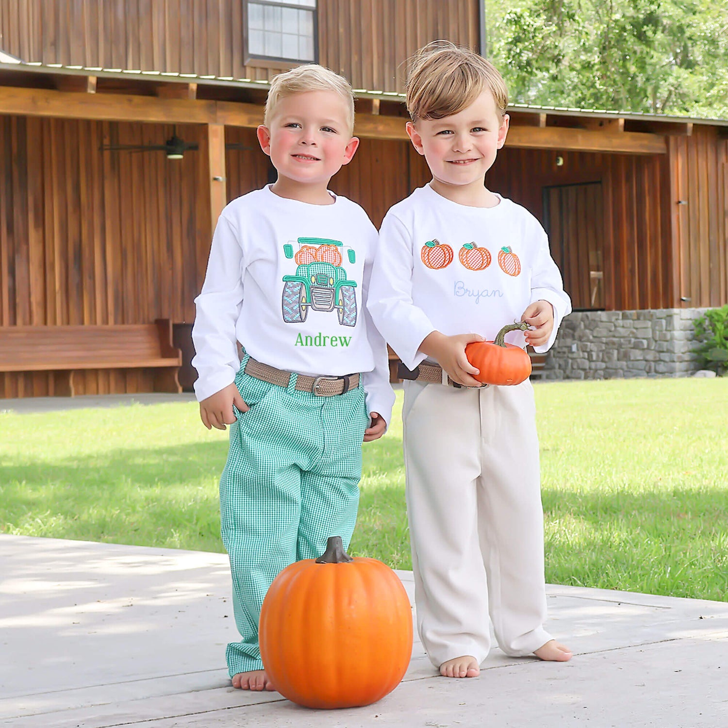 It’s pumpkin patch season with our Cluster Pumpkin Tractor White Long Sleeve Shirt! This white knit shirt features a cool tractor applique filled with pumpkins. It’s perfect for playtime fun, comfort, and cuteness! Don’t forget to add a name monogram below the applique for a special touch!