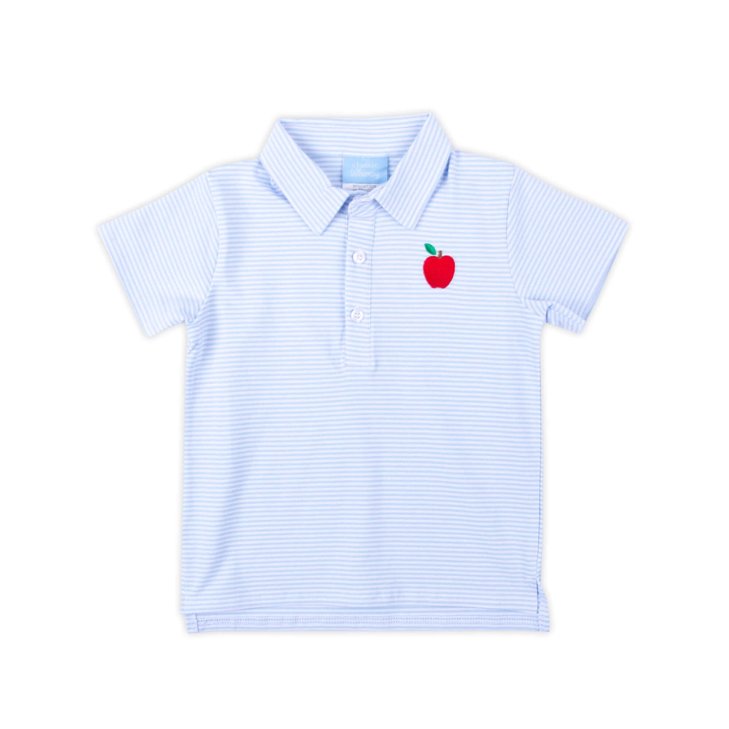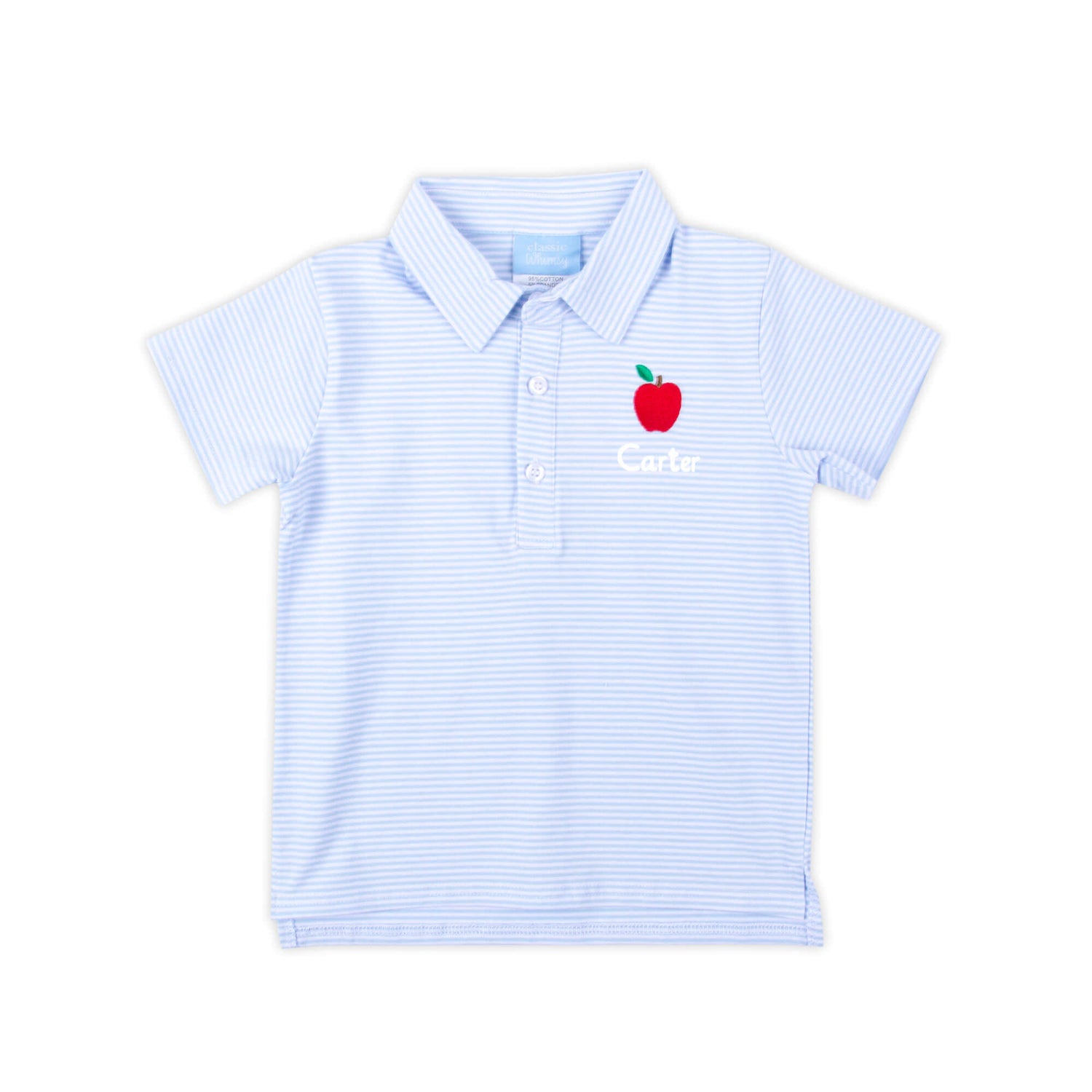 Your little one will be ready for school in the Darling Apple Light Blue Stripe Polo! This light blue striped soft knit polo features an embroidered apple on the side. Its timeless style allows you to mix and match effortlessly with your favorite bottoms. Ideal for both learning and play! Add a monogram for a personalized touch.