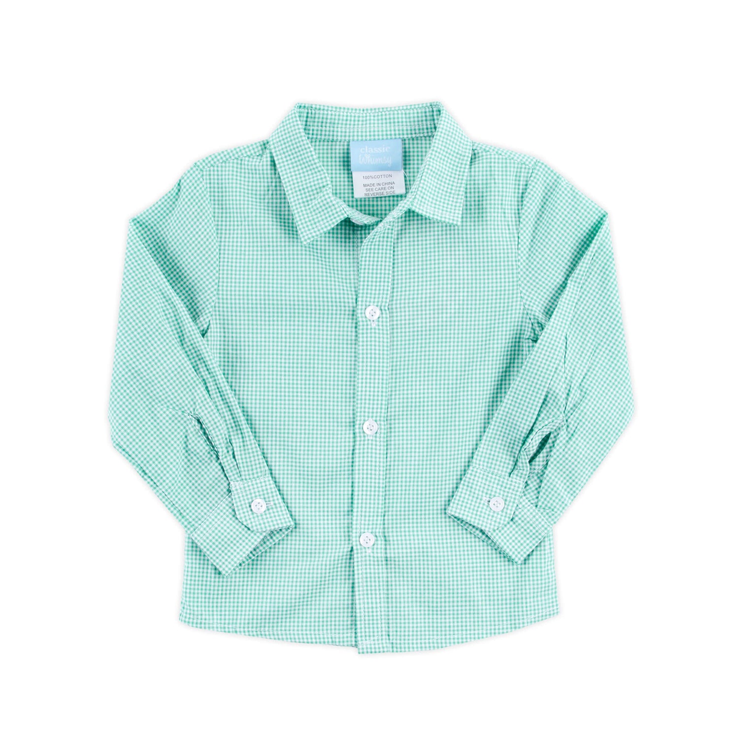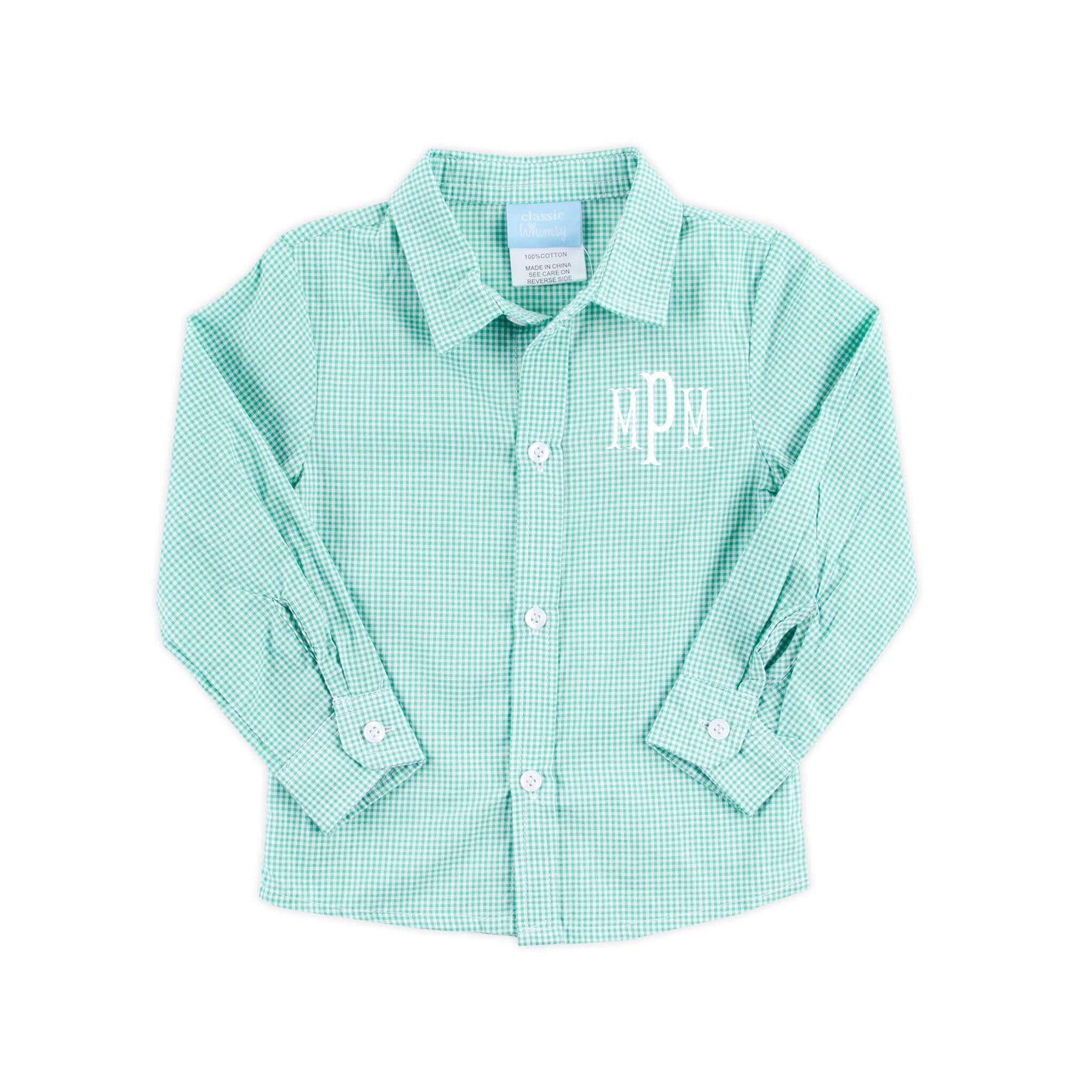 Elevate your little one's wardrobe with our Mint Green Gingham Boy Button Down Shirt, the perfect addition for the season. This shirt is both stylish and versatile. Ideal for outings to the pumpkin patch, Thanksgiving gatherings, Christmas celebrations, or any special occasion, this shirt is sure to make your little one stand out. Personalize it with a monogram to make it even more special and unique!