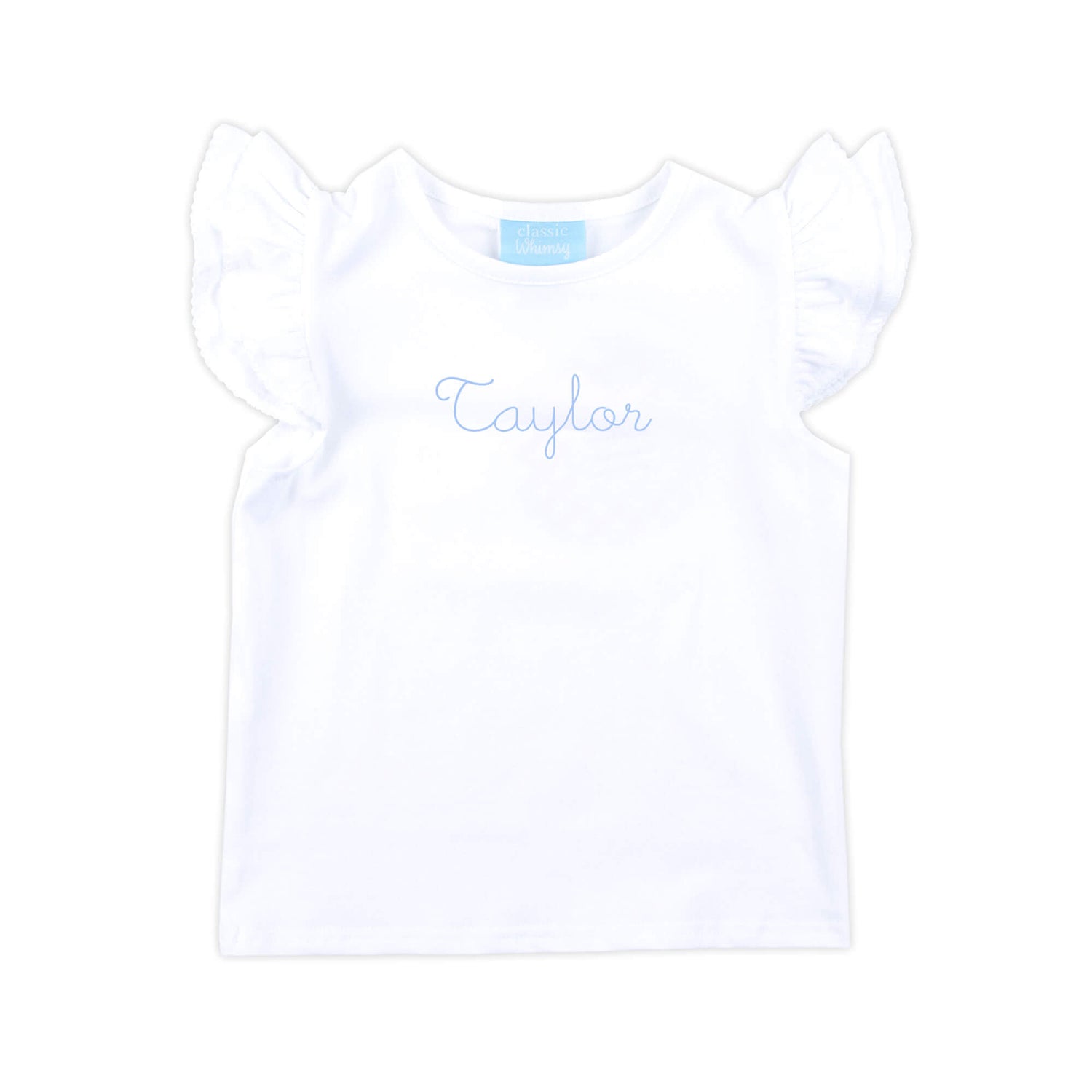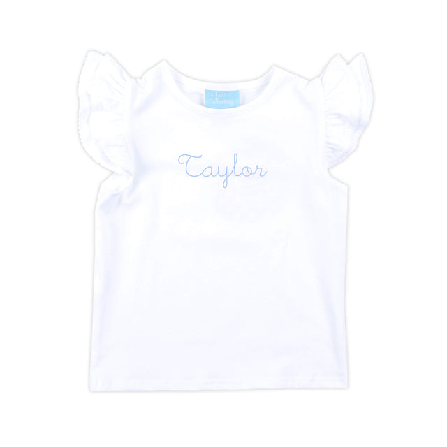 Kick off the school day with our Solid White Top. This white top is both fun and stylish, ideal for the first day of school. The top features fluttered sleeves with red picot trim. Personalize the top with a monogram for an extra special touch.