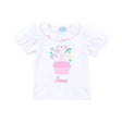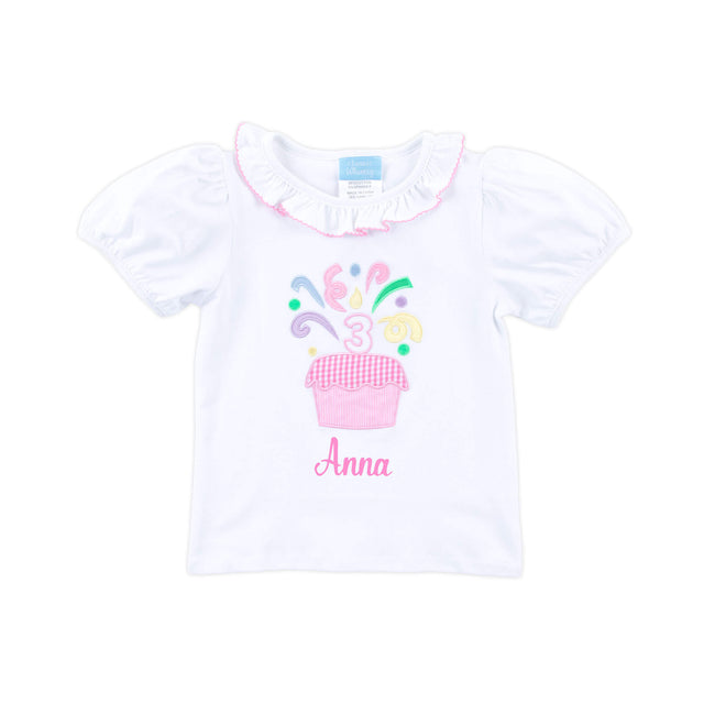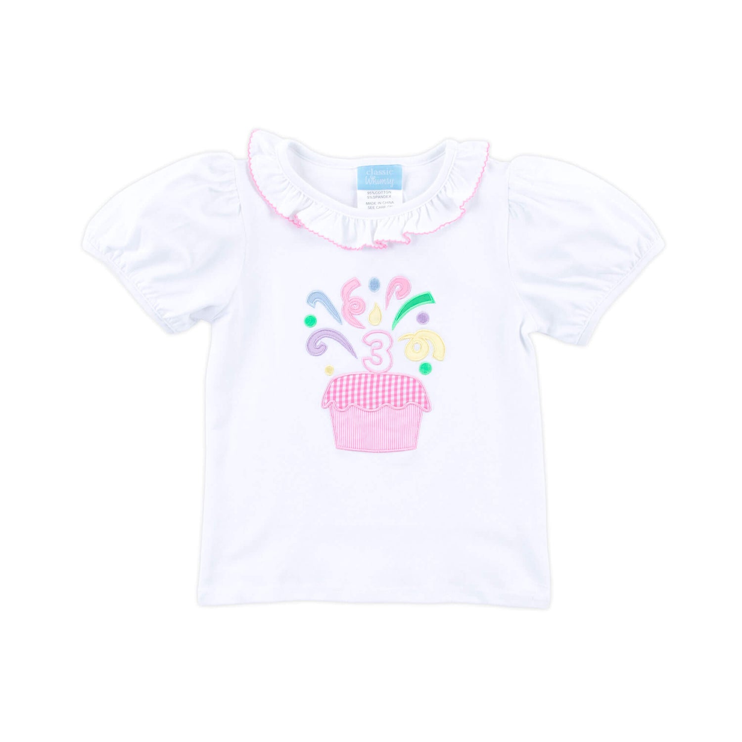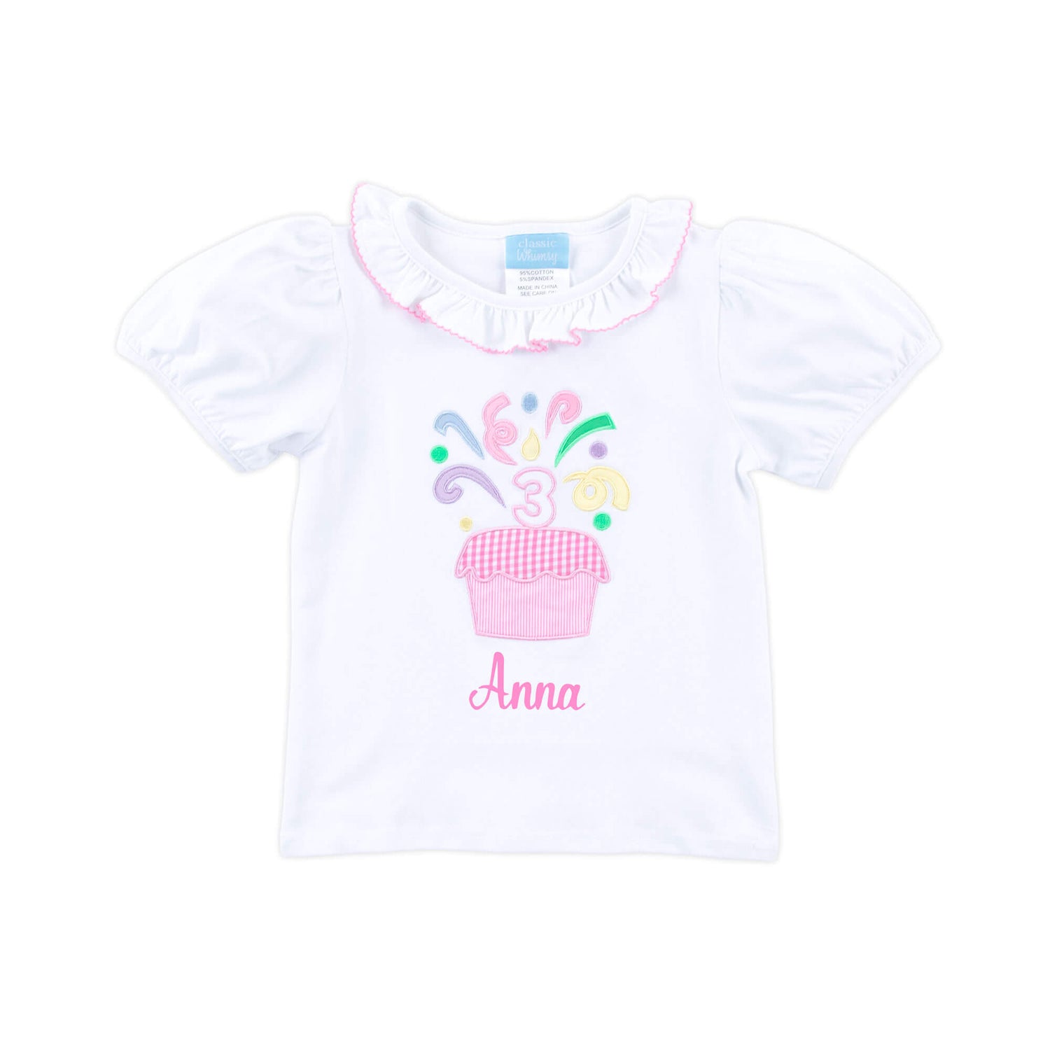 This Third Birthday Cupcake Ruffle Top is perfect for birthday fun, comfort, and cuteness! Featuring an adorable ruffle collar with pink picot trim, bishop sleeves, and a fun 3rd birthday cupcake applique, it’s a sweet and stylish choice. Don’t forget to add a name monogram for a special touch!