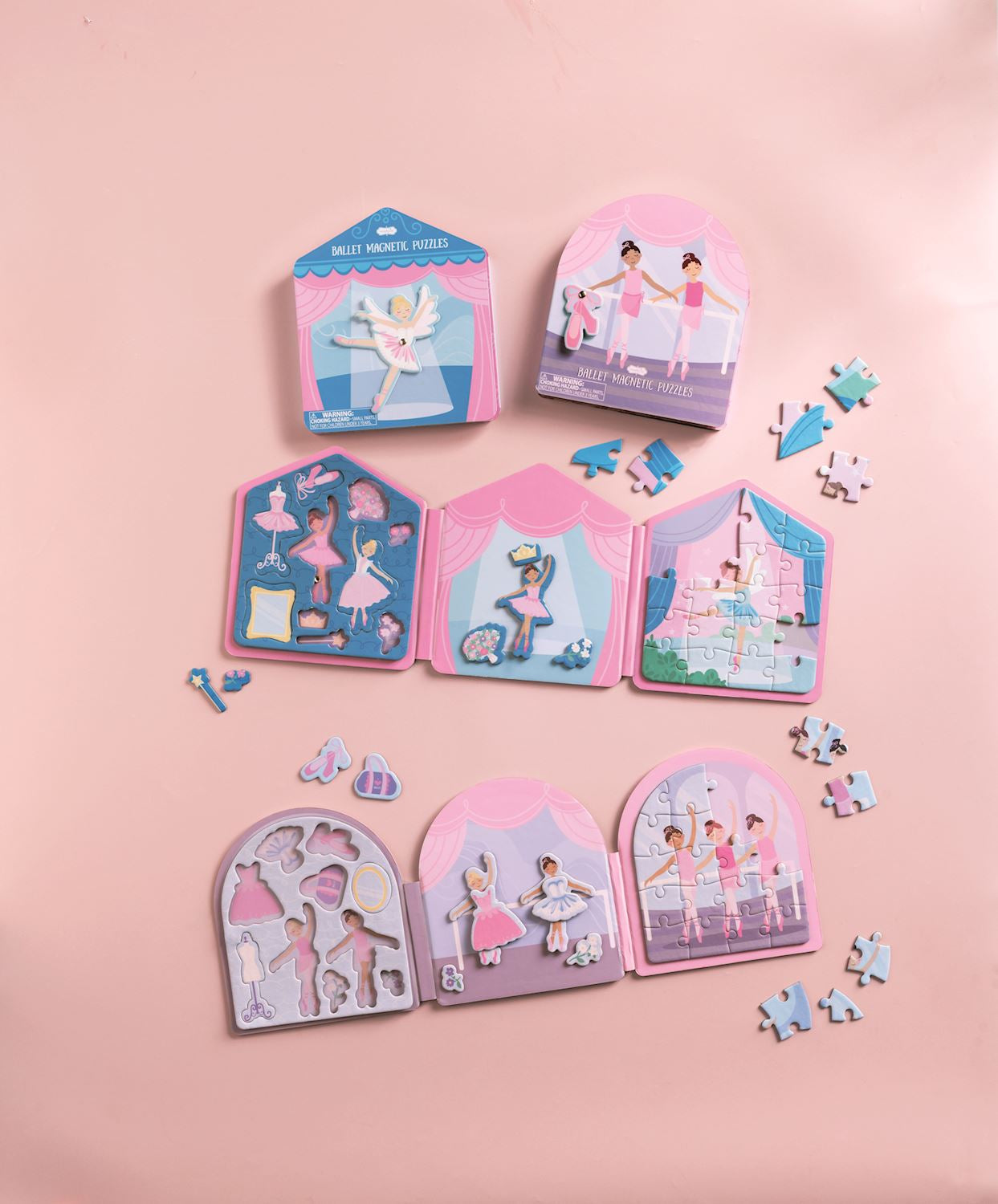 Magnetic Puzzle Book offers a delightful and interactive experience for young ballet enthusiasts. This charming set includes a beautifully illustrated play scene that captures the magic of a ballet recital, complete with a stage and audience. The magnetic puzzle pieces feature adorable ballerinas, props, and accessories, allowing children to create their own enchanting performances. Designed for convenience, the magnetic pieces stay securely in place, making it perfect for travel and on-the-go fun. Ideal for children aged 3 and up, this compact 7 1/2" x 6 1/2" puzzle book encourages creativity, storytelling, and fine motor skills development. Crafted from durable paper, it promises hours of imaginative play and is a wonderful gift for any budding dancer.