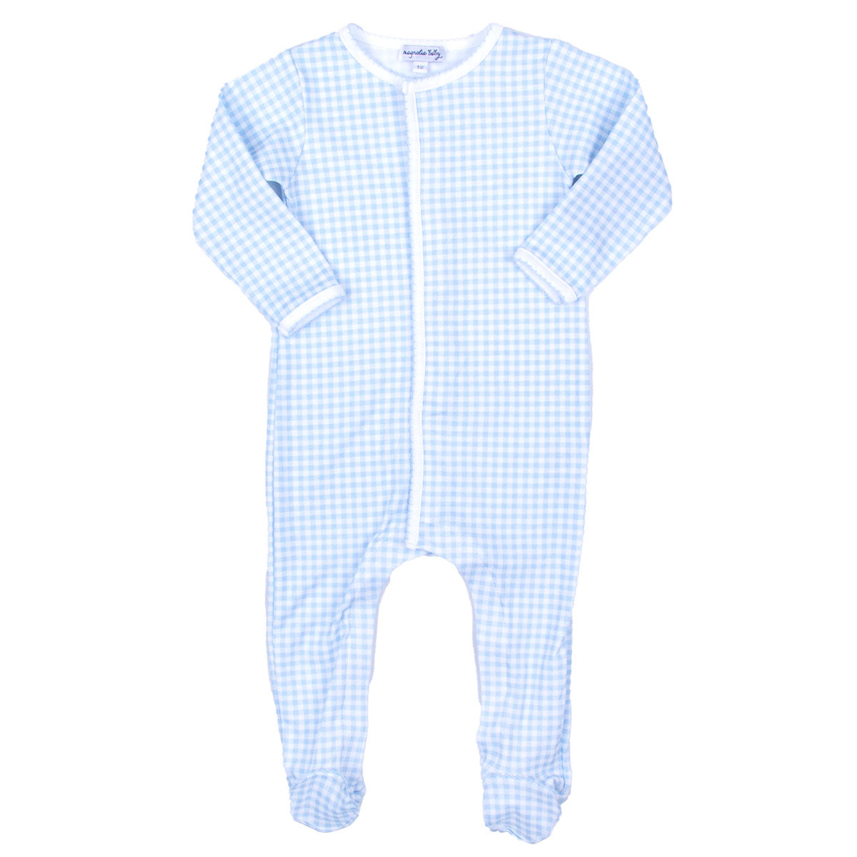 The sweetest baby sleeper with feet made from the softest pima cotton. Pink includes a soft picot trim. Coordinates with other items in the Mini Checks Collection from Magnolia Baby.