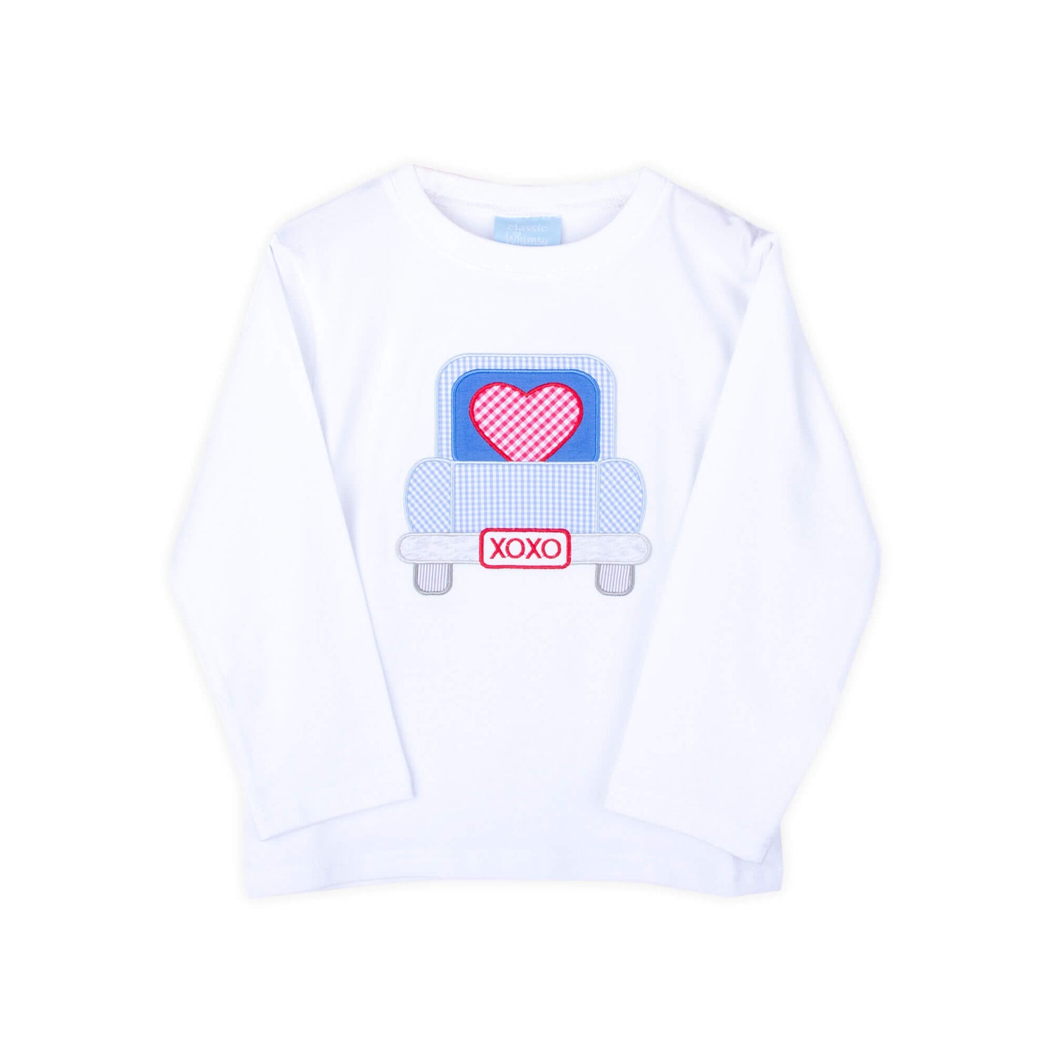 Get ready for Valentine’s Day fun with our Heart Truck White Long Sleeve Shirt! Perfect for school, playdates, and playtime adventures, this charming white shirt features an applique of a truck with a heart. Add a monogram below the applique for a personalized touch, making it extra special for the season of love.