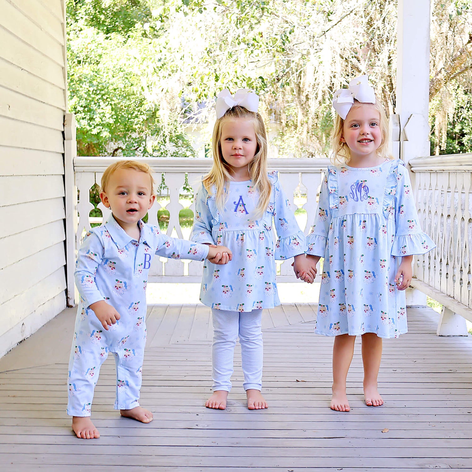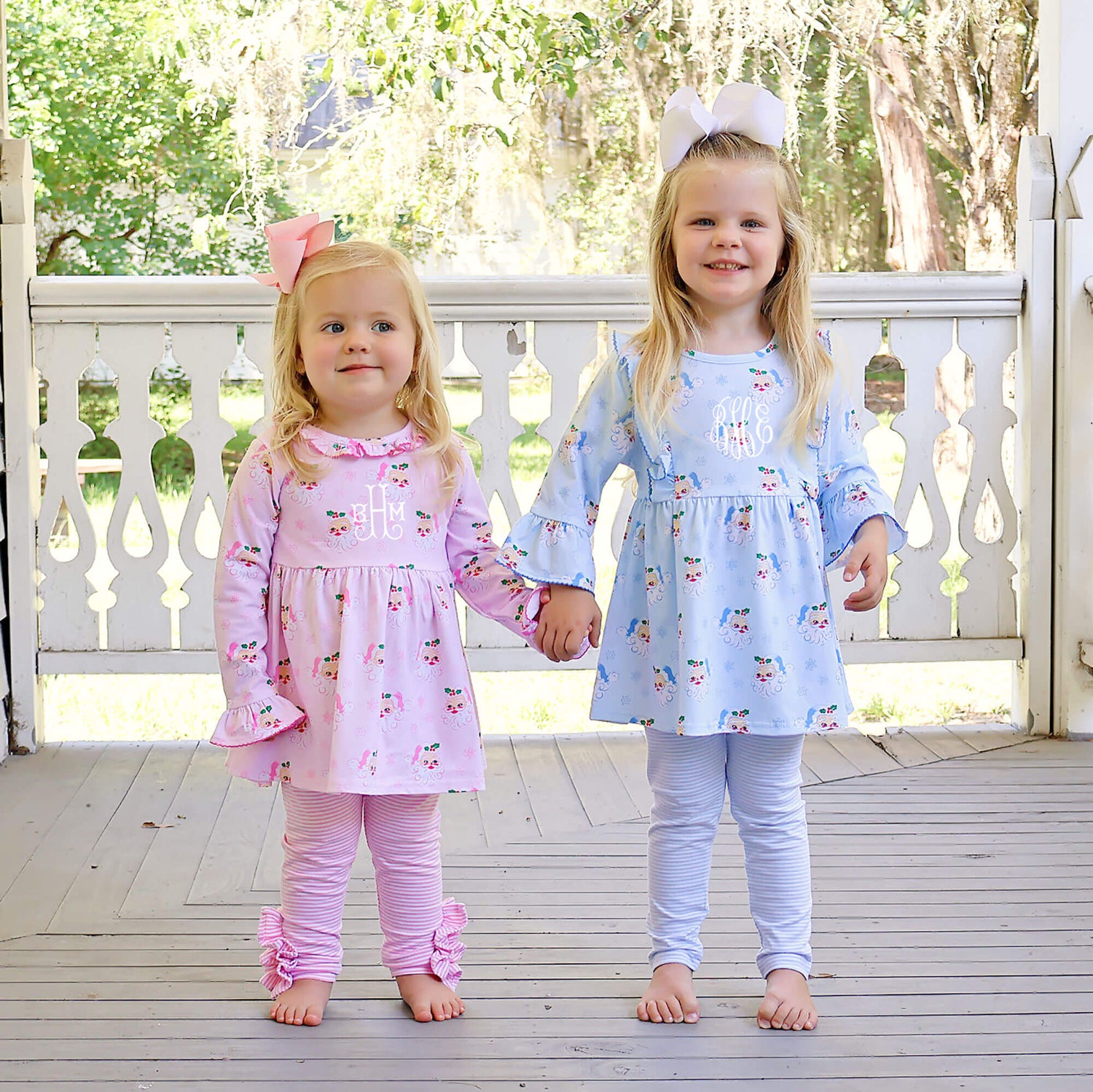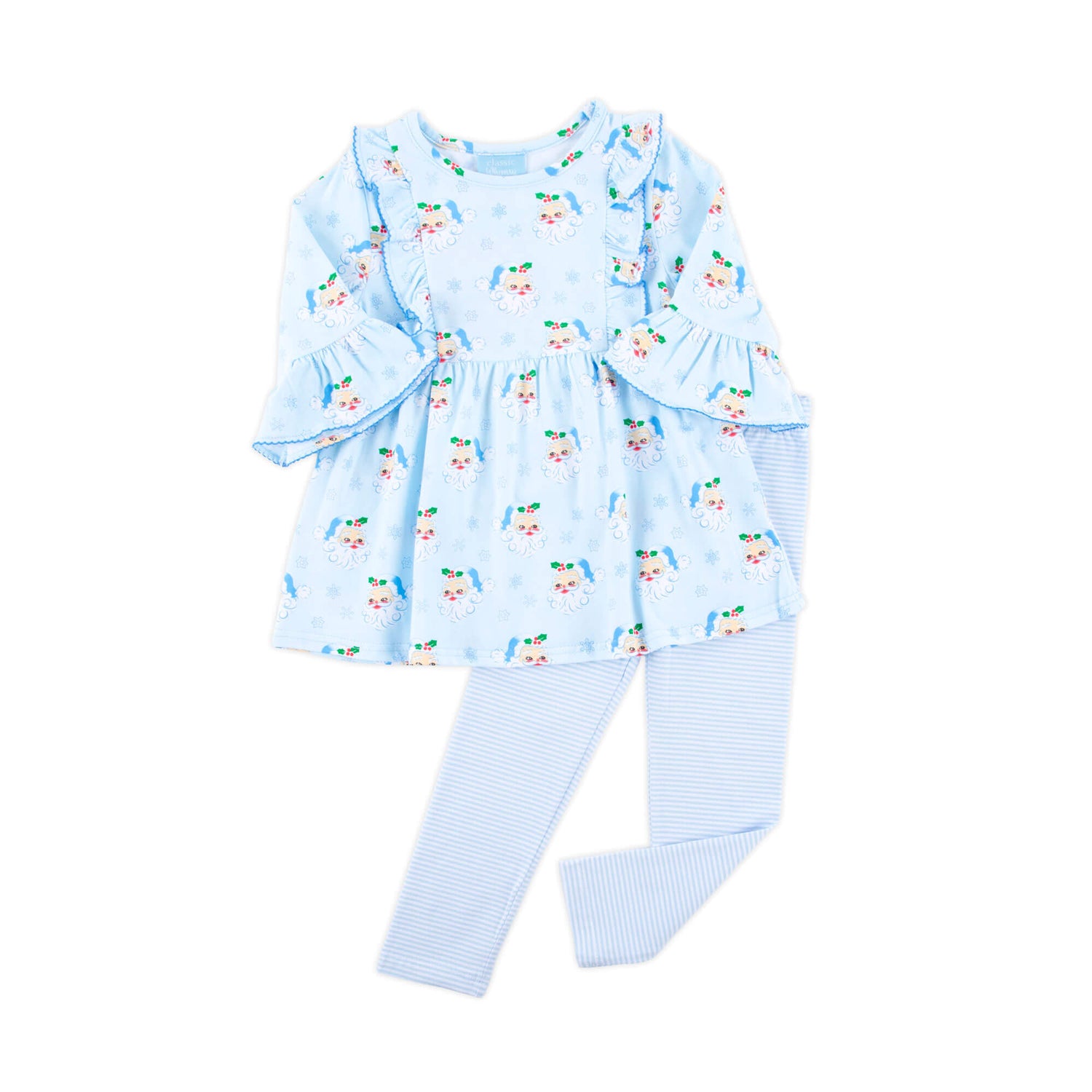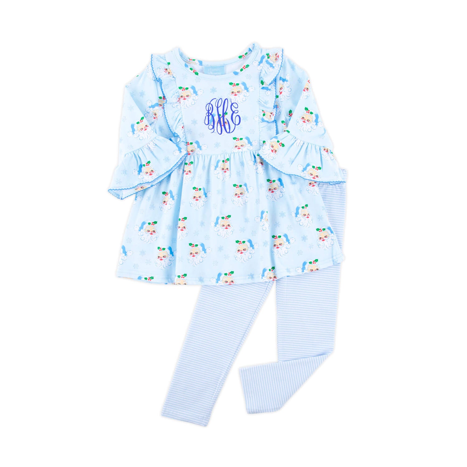 Your little one will enjoy the holiday season in style with our Vintage Santa Blue Olivia Legging Set. This Olivia-style top features a beautiful blue happy Santa print and is designed with 3/4 sleeves. The set is coordinated with blue stripe leggings, making it fun and comfortable. Add a monogram for a personalized touch!