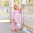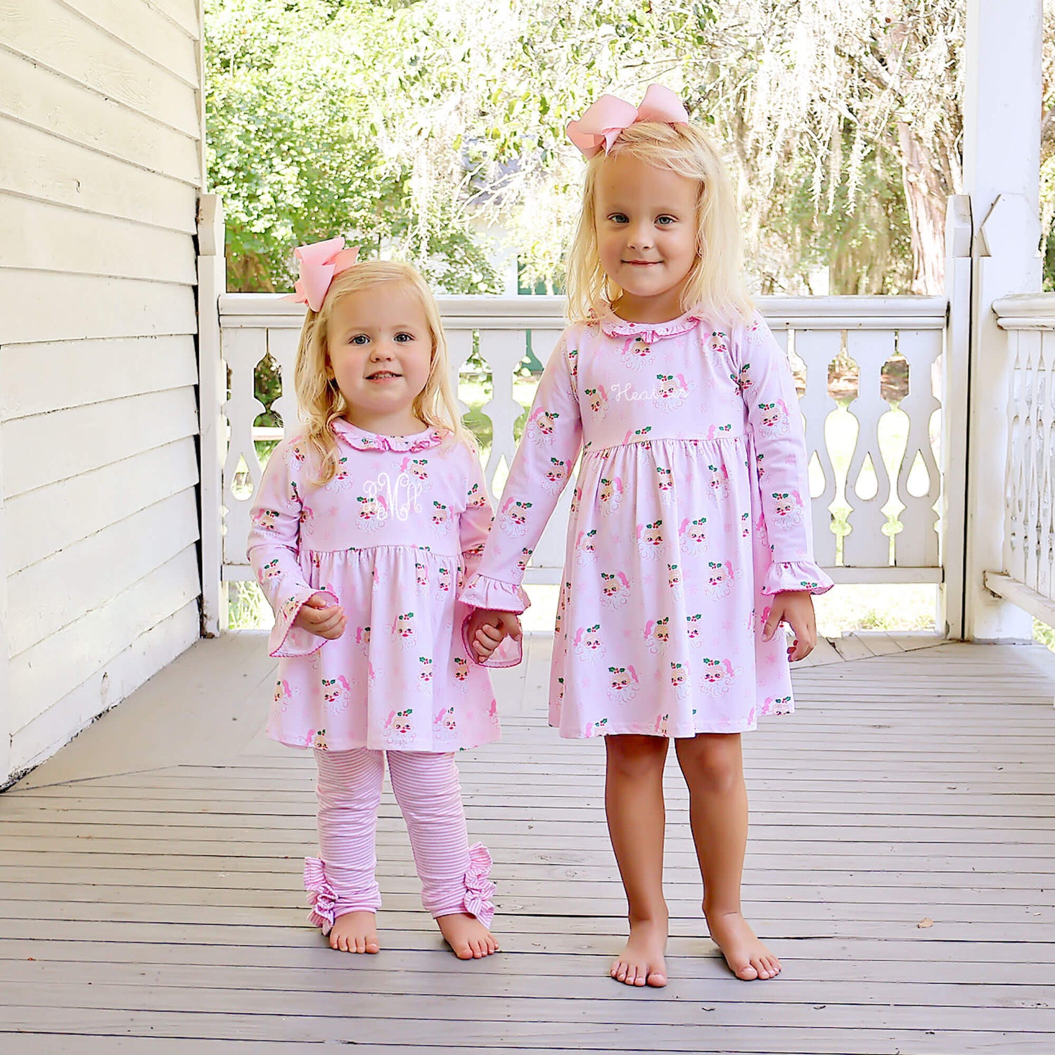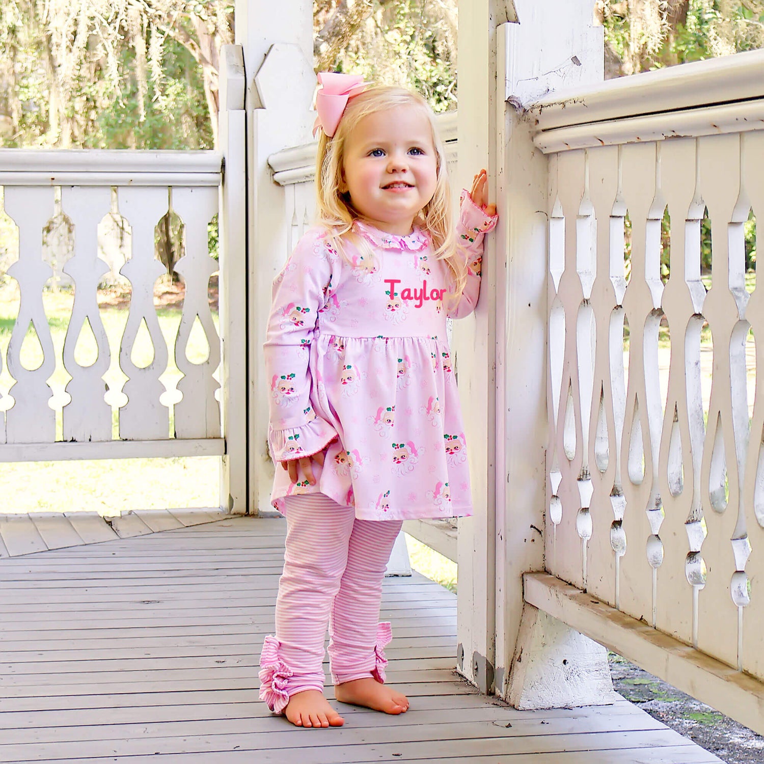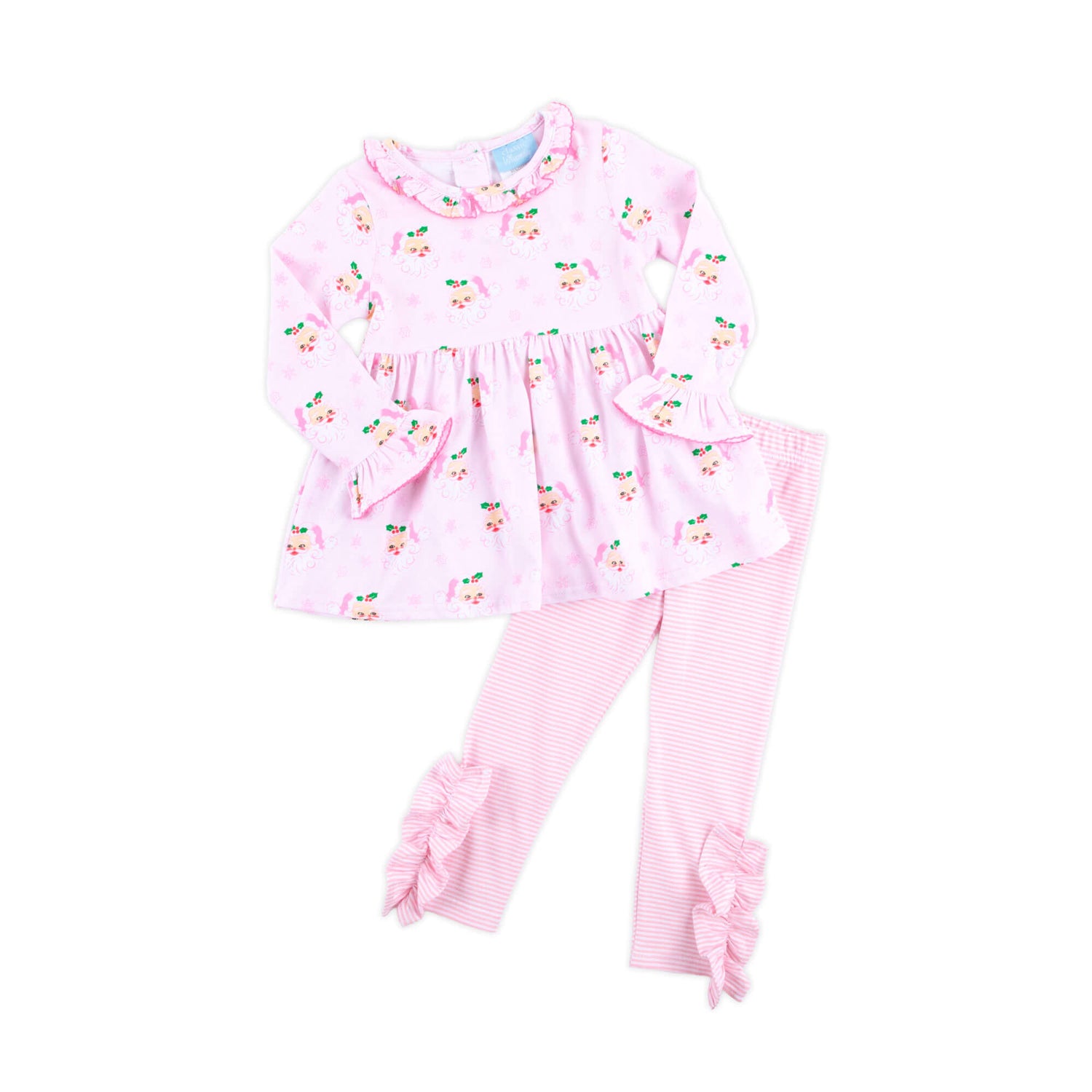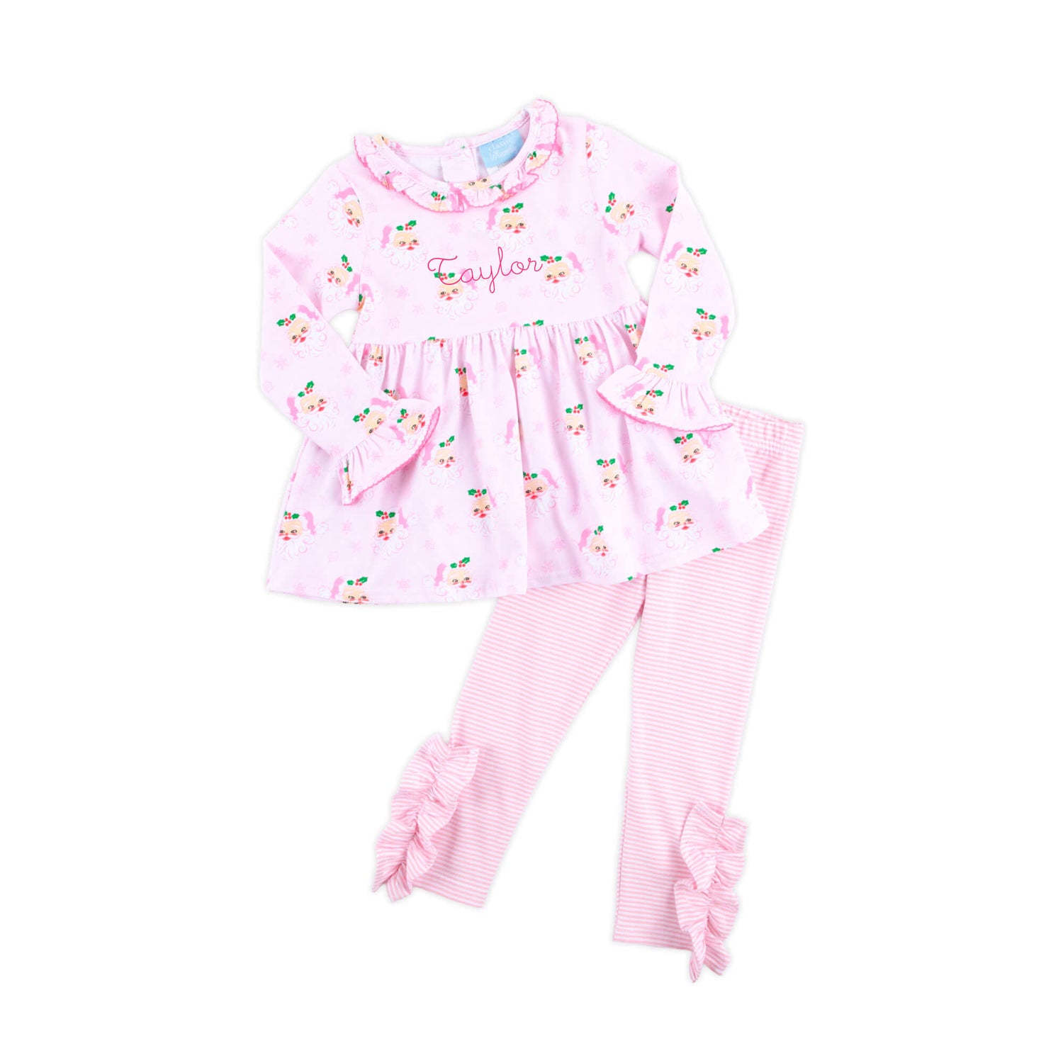 Get ready to spread Christmas cheer with our Vintage Santa Pink Eden Legging Set! This pink knit top features the sweetest happy Santa print, long sleeves, and a ruffle collar. Paired with pink striped leggings, making it the perfect outfit for holiday parties, playtime fun, comfort, and cuteness!
