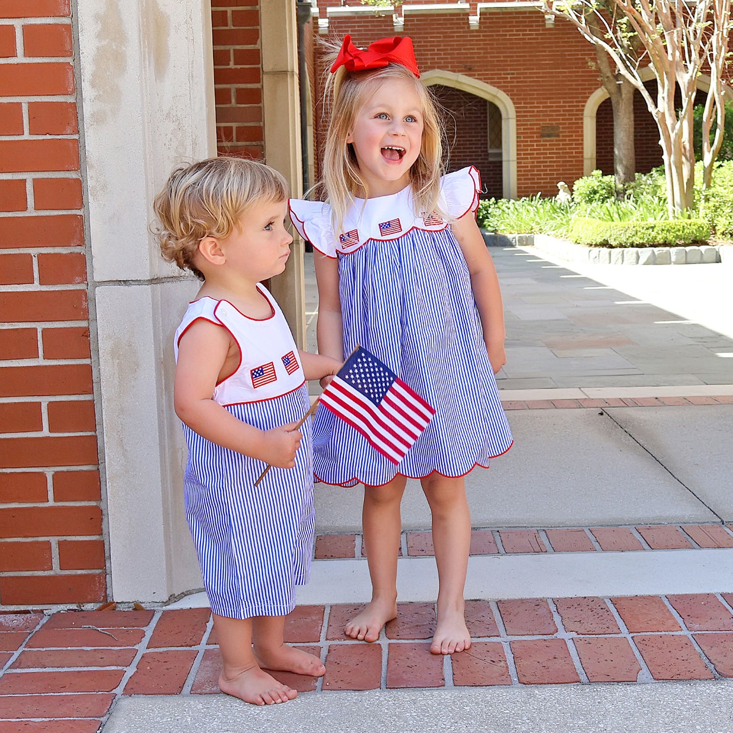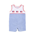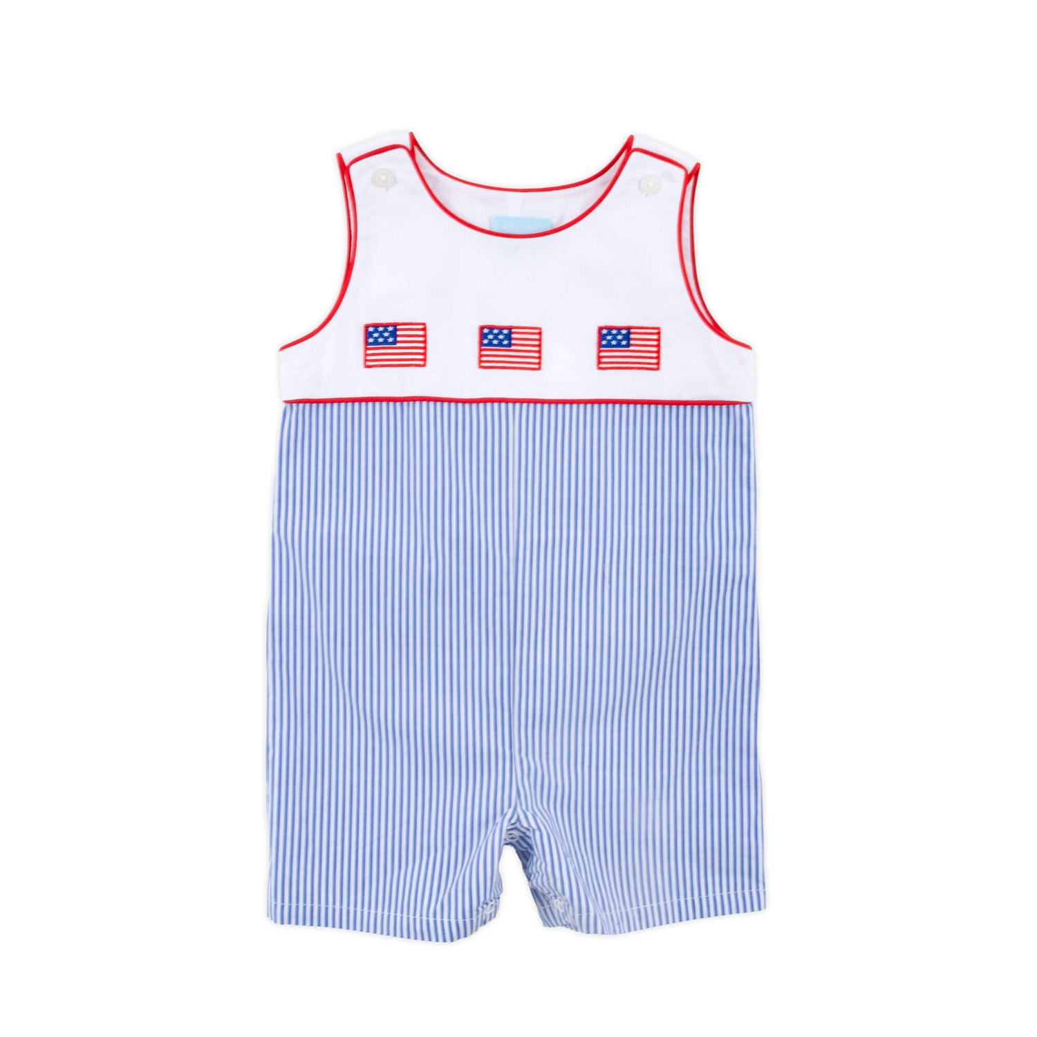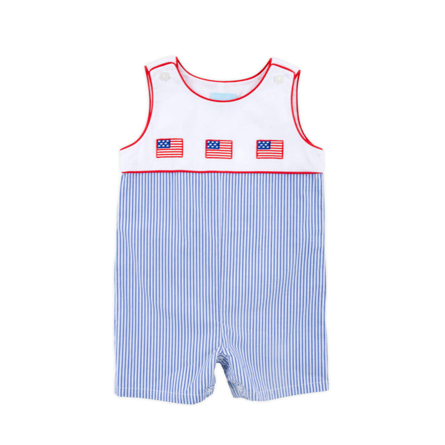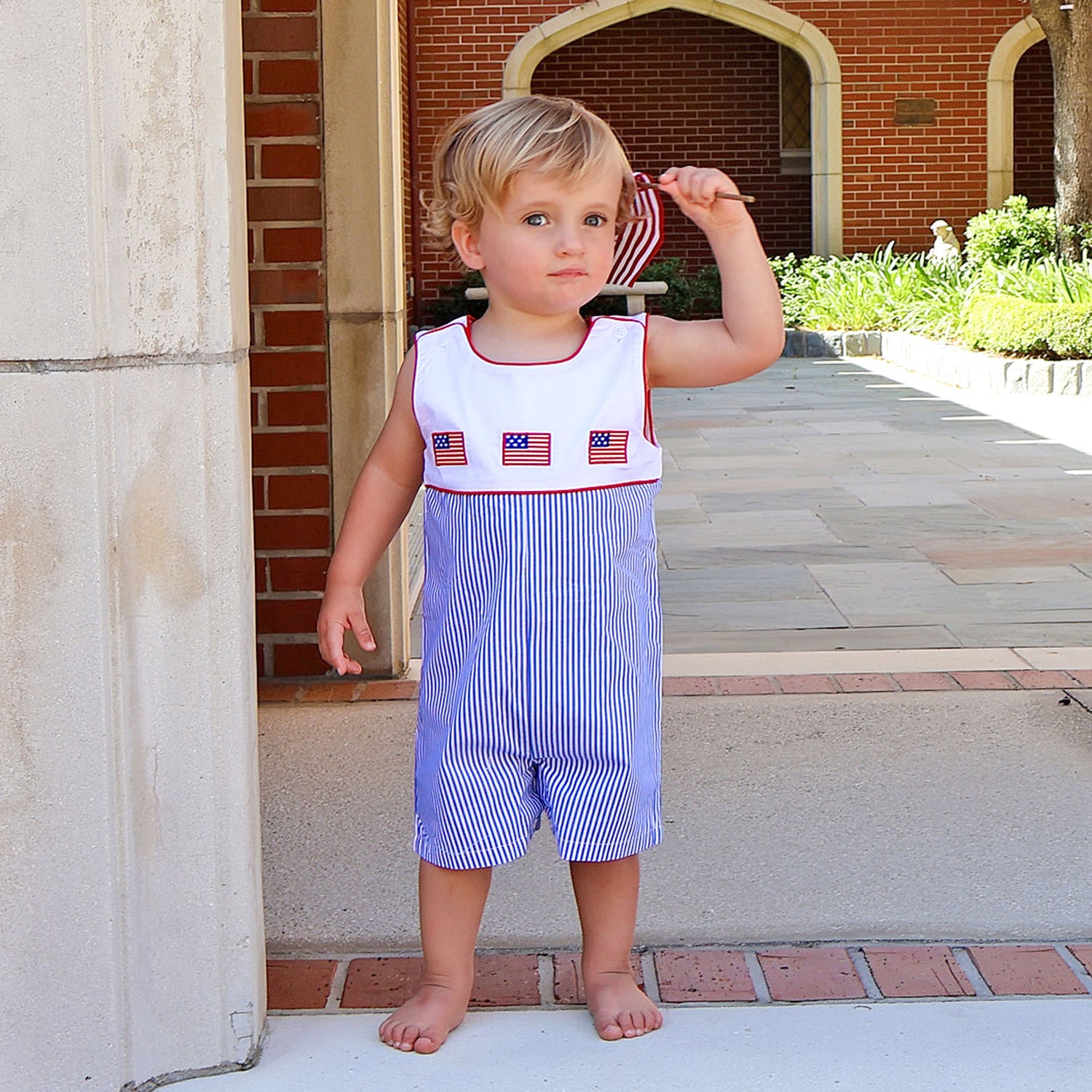This American Flag Blue Stripe Jon Jon is perfect for celebrating the 4th of July and enjoying fireworks. This blue striped Jon Jon is adorned with embroidered American flags, capturing the patriotic spirit. Shoulder buttons and snaps in stride allow for easy changes.