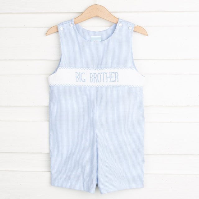 Welcoming a new addition to the family? Let Big Brother show his pride with this adorable light blue Jon Jon. Smocked with the words "Big Brother" it features a gingham print and snaps in stride.