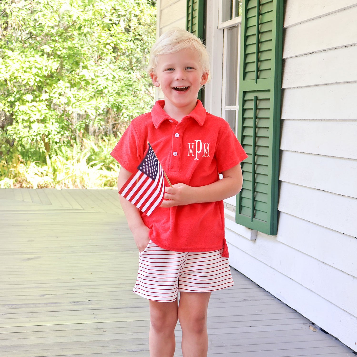 This Bold, Bright and Brave Polo Short Set is the perfect outfit for watching fireworks and enjoying outdoor play. The red French terry polo is paired with coordinating red striped waistband shorts for a classic patriotic look. Add a monogram to personalize this style.