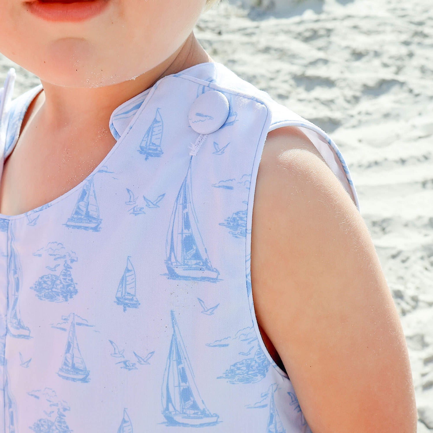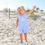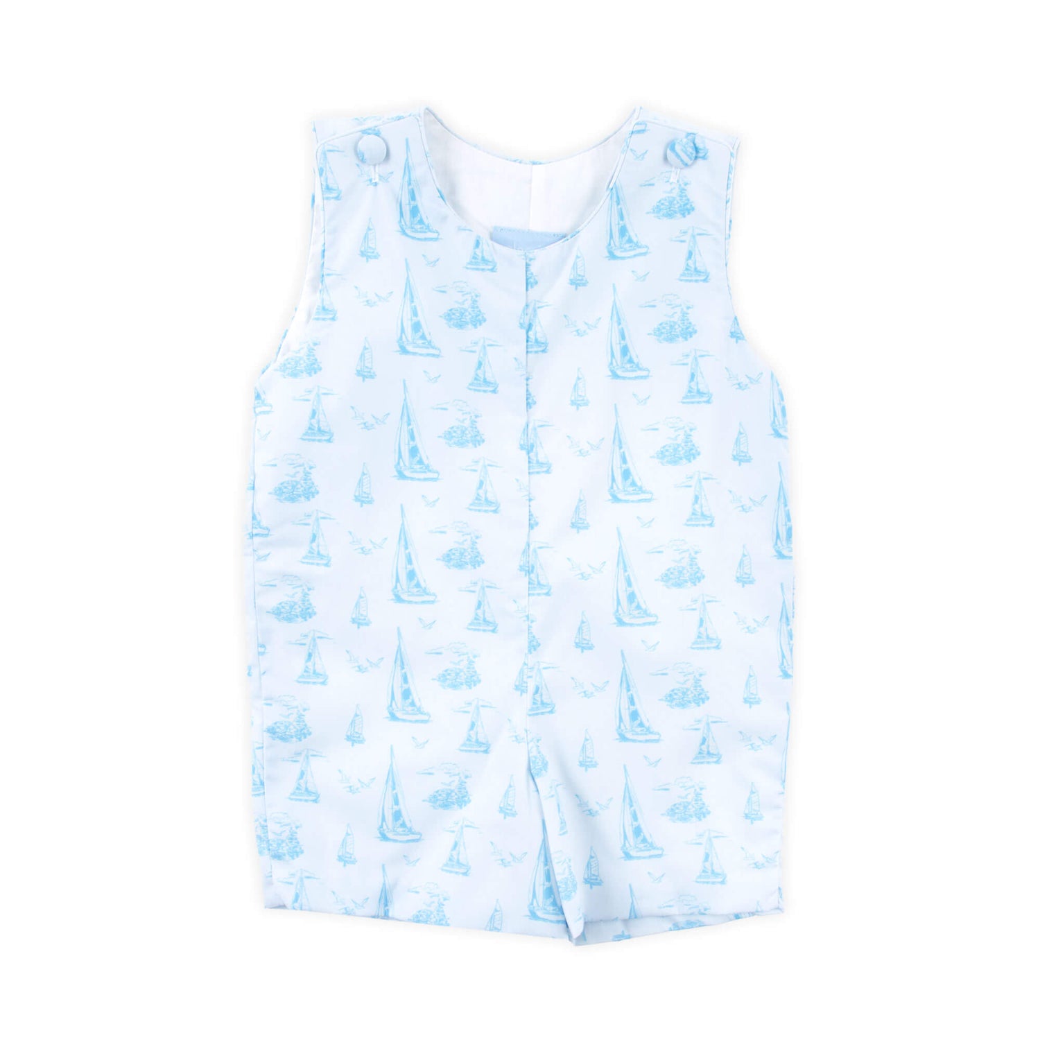 The Nautical Blue Sailboat Jon Jon is the perfect nautical outfit for summer. Featuring a lovely blue sailboat toile print, this charming style offers a timeless seaside look. Shoulder buttons and snaps at the stride allow for easy changes.