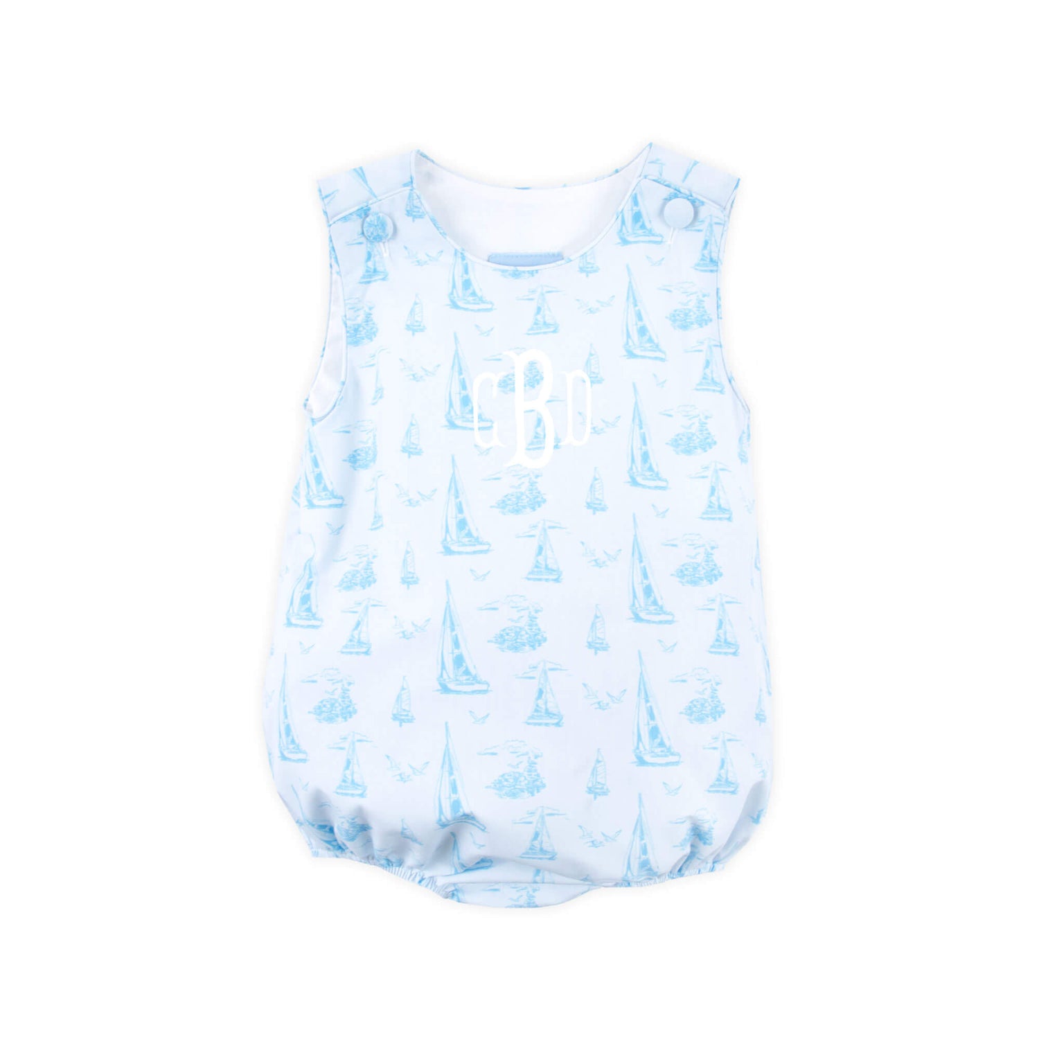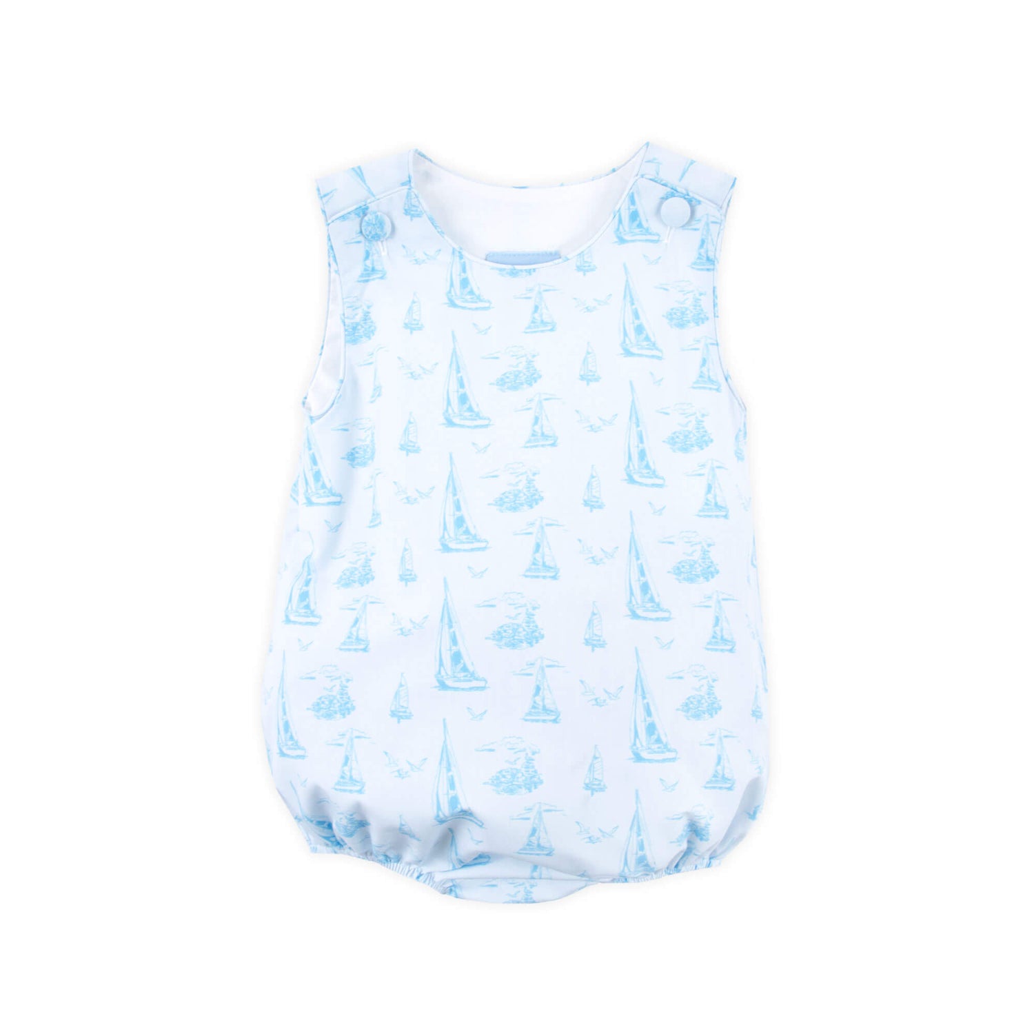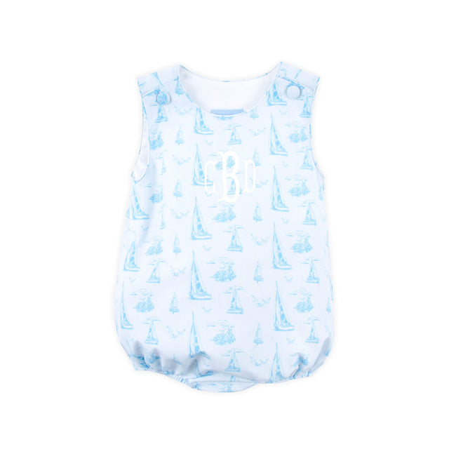 The Nautical Blue Sailboat Sun Bubble is the perfect nautical outfit for summer. Featuring a lovely blue sailboat toile print, this charming style offers a timeless seaside look. Shoulder buttons and snaps at the stride allow for easy changes.