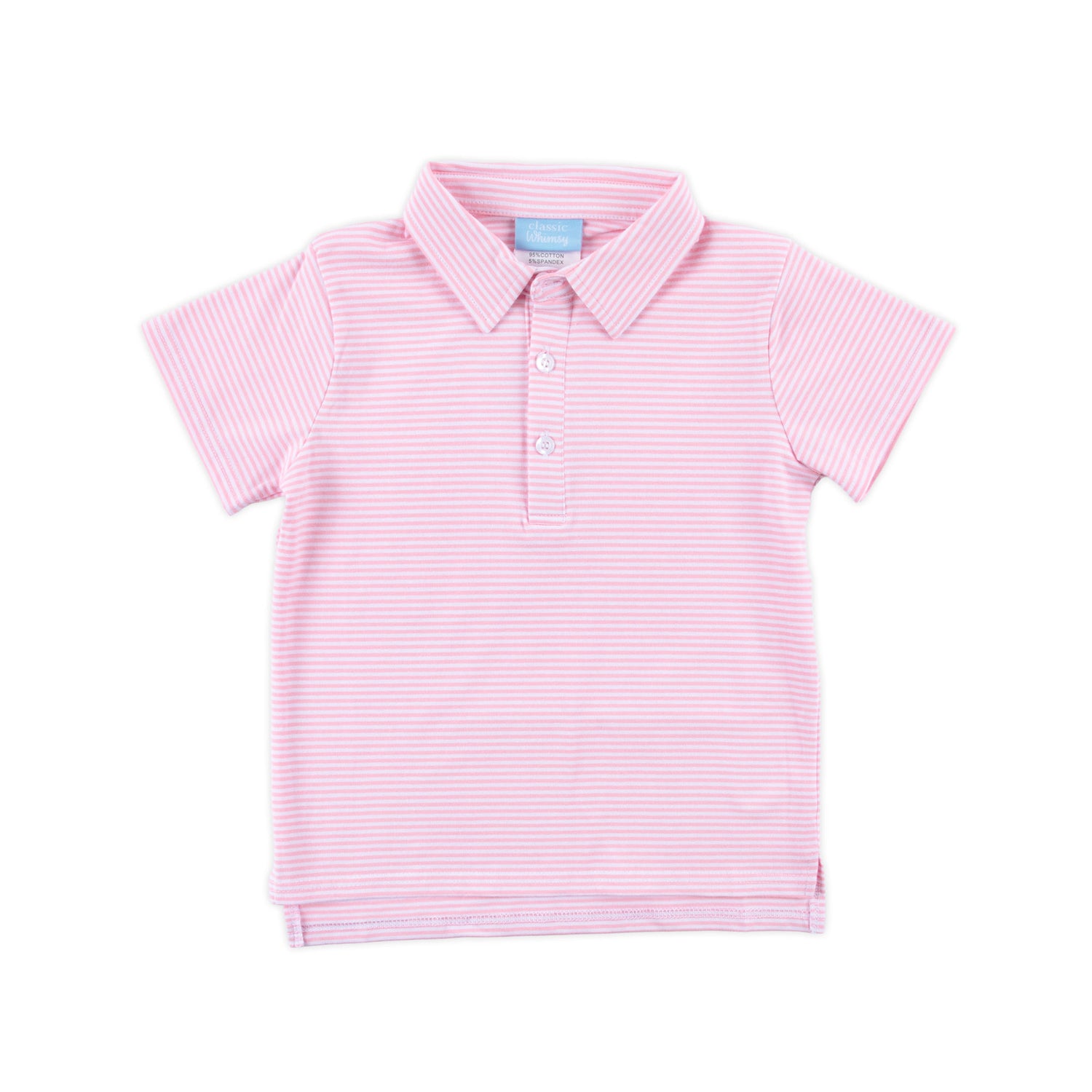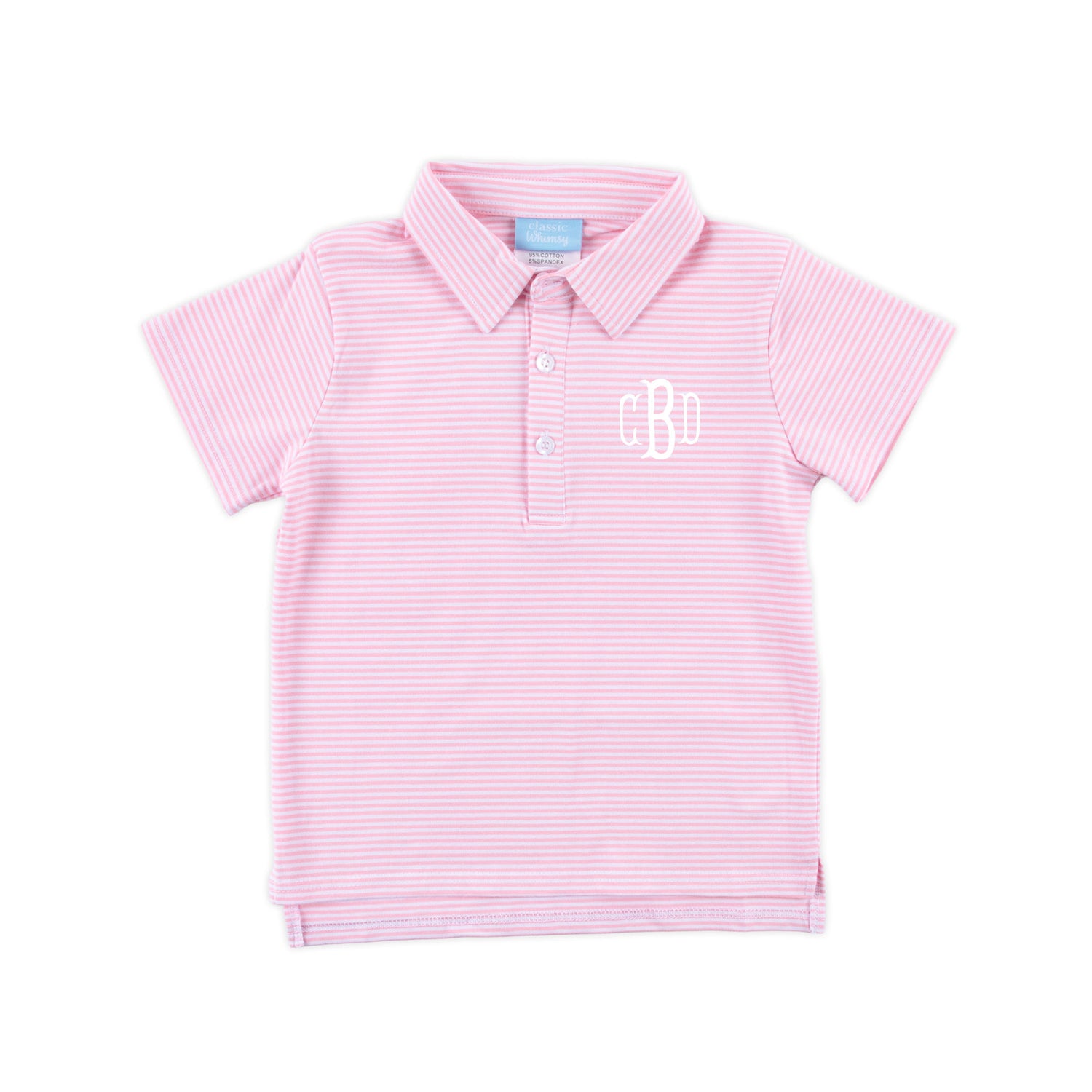 Dress up for playtime in our Polo Shirt Pink Stripe. This classic pink polo, with its timeless style, allows you to mix and match effortlessly with your favorite bottoms. Perfect for various occasions this spring and summer, this shirt brings a playful touch to any day. Consider adding a monogram to personalize your look and make a statement.