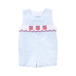 Happy Fourth of July! Celebrate in style with this Flag Smocked Blue Stripe Seersucker Jon Jon. This striped seersucker Jon Jon features smocked American flags for a classic patriotic look. Shoulder buttons and snaps in stride allow for easy changes and make it ready for all-day celebrating.